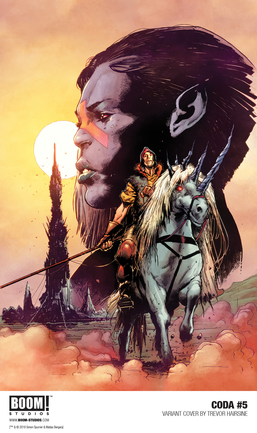 In CODA #5, featuring a main wraparound cover by Bergara, along with a variant cover by Trevor Hairsine (Mighty Morphin Power Rangers: Shattered Grid), Hum and Serka must set out to infiltrate the bandit city of Thundervale to investigate the existence of a supposed surviving Wihtlord…the dark beings that set about the apocalypse.