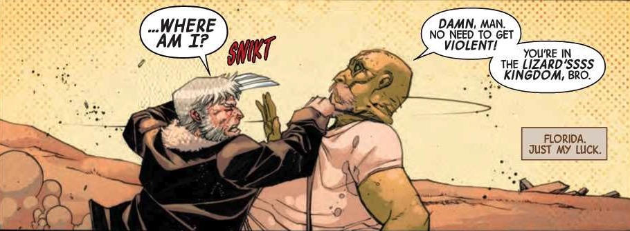 Of course, this is the Florida of The Wastelands, the post-apocalyptic alternate future from which Old Man Logan originally hails. Though, it seems that it's not really so much different than regular Florida. And when Wolverine asks for directions, he quickly finds himself in a scuffle with some people who may or may not be tripping on bath salts…