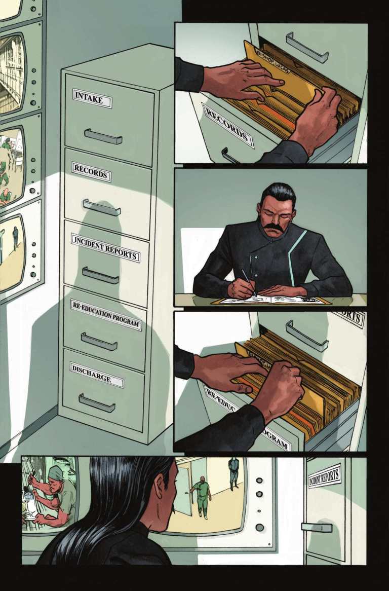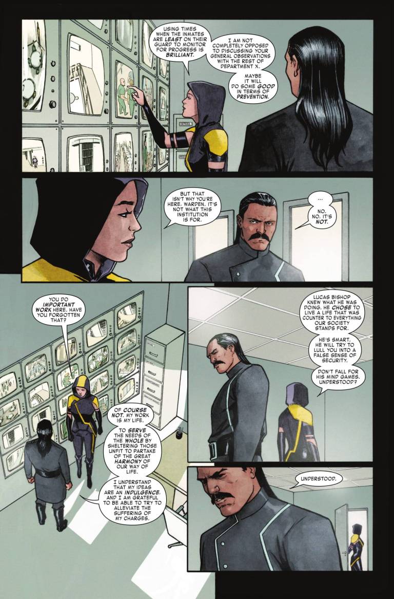 In this preview of next week's issue, we see Forge, who is the warden of the prison, receive a visit from Psylocke of Department X, the secret police arm of the X-Men which is tasked with tracking down offenders. Forge seems to view his job as one of rehabilitation and thinks that Bishop could be a model prisoner.