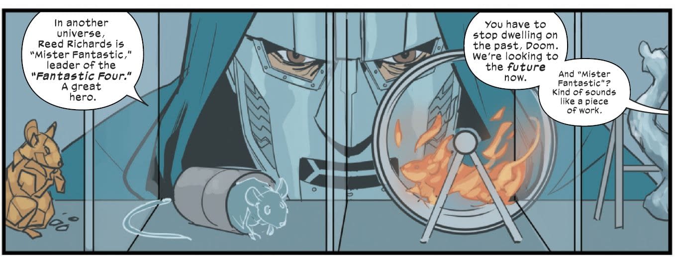 The Ultimate Doom is their Reed Richards, made that way by the Maker, the former Ultimate Reed Richards. The cruelty, but also the hope. And in today's Ultimates, it has blown Ultime Doom's mind, and possibly temporal and spatial comprehension of everything.