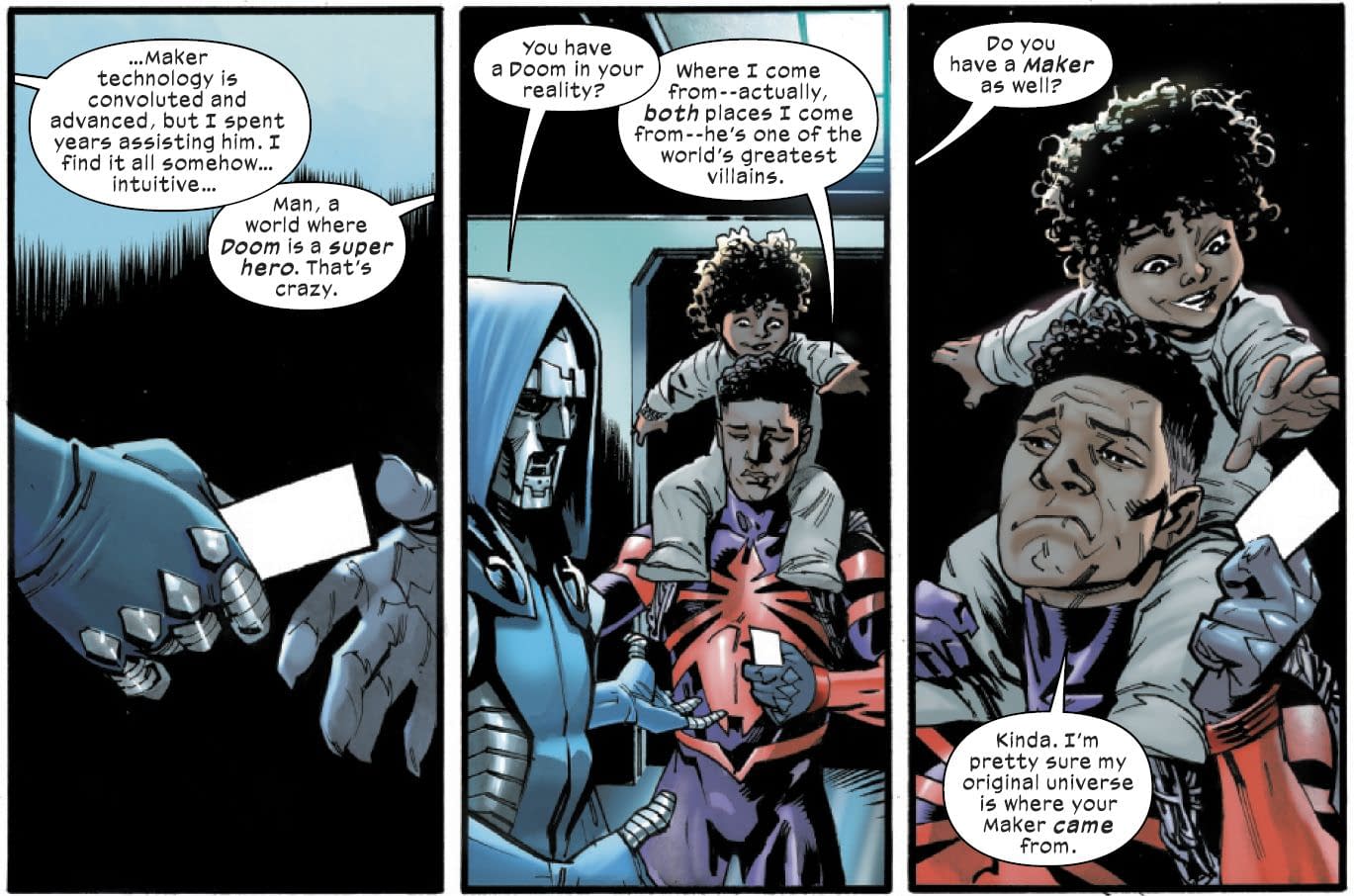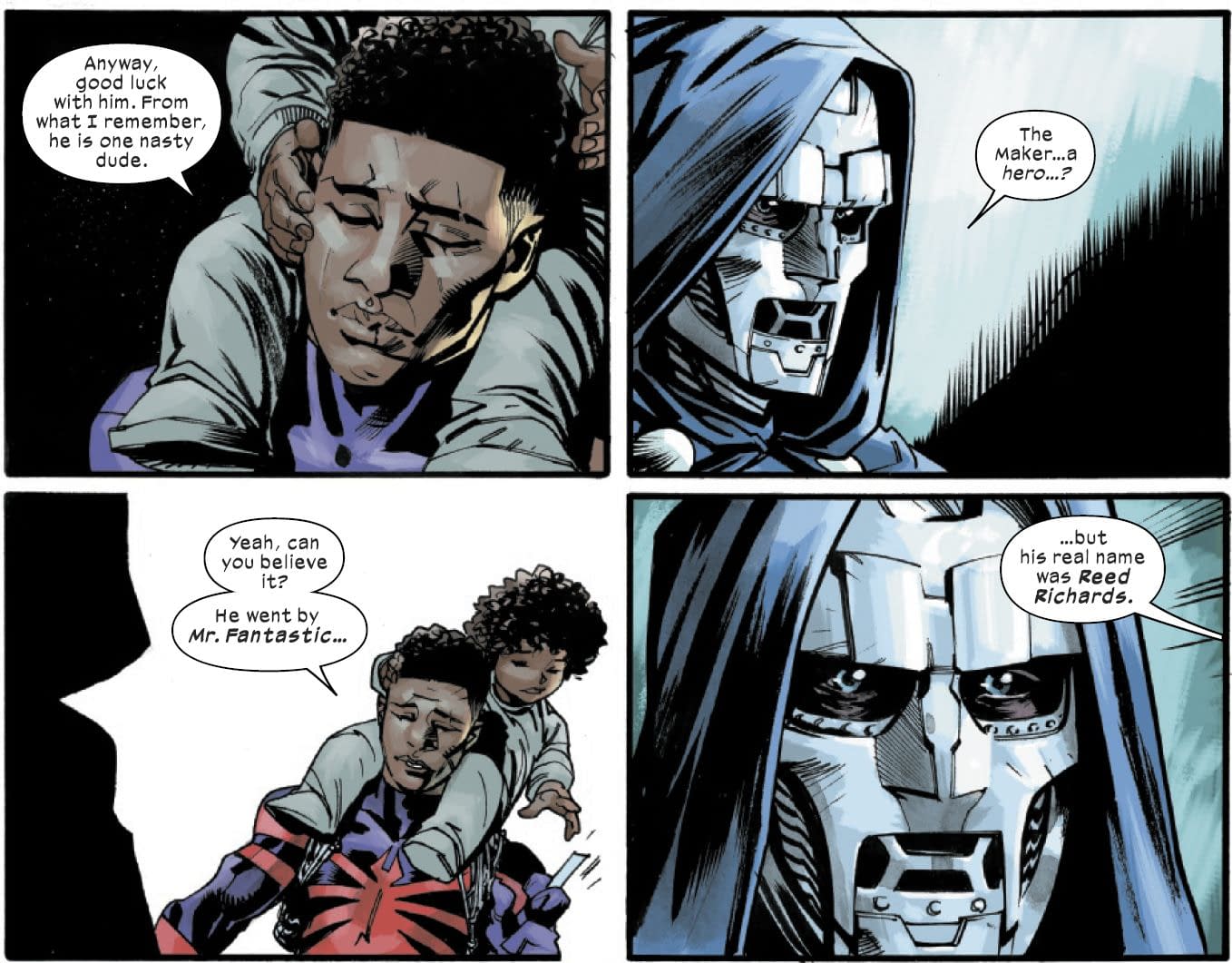 Miles Morales has full knowledge of bnoth universes and the Secret Wars that came inbetween. And Doom is left with what was, and what could have been.