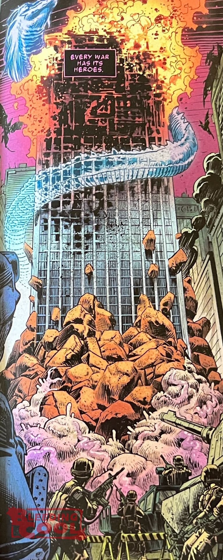 We have a Fantastic Four Baxter Building in flames, rubble and goo..And, through the streets of New York City, a giant, monstrous, red and blue spider carrying the corpse of a Spider-Man beneath it, alongside the Tony Stark Monster seen on that cover…