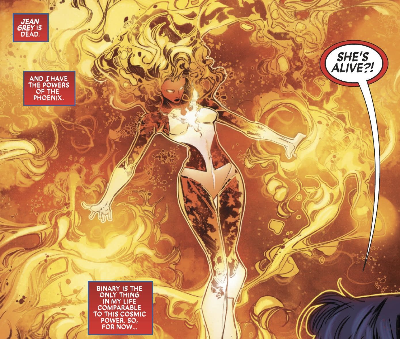 THIS IS BINARY…AND THE UNIVERSE BURNS WITH HER! X YEARS LATER, in the ashes of the old world, to survive she is reborn – a cosmic force channeling the Phoenix itself. With the universe crumbling, BINARY returns to save what's left. But power this great always comes with a price… and the end of everything might begin with her. - World Of Revelation #1 by Ryan North, Al Ewing, Jesus Merino, Agustin Alessio, Phil Noto