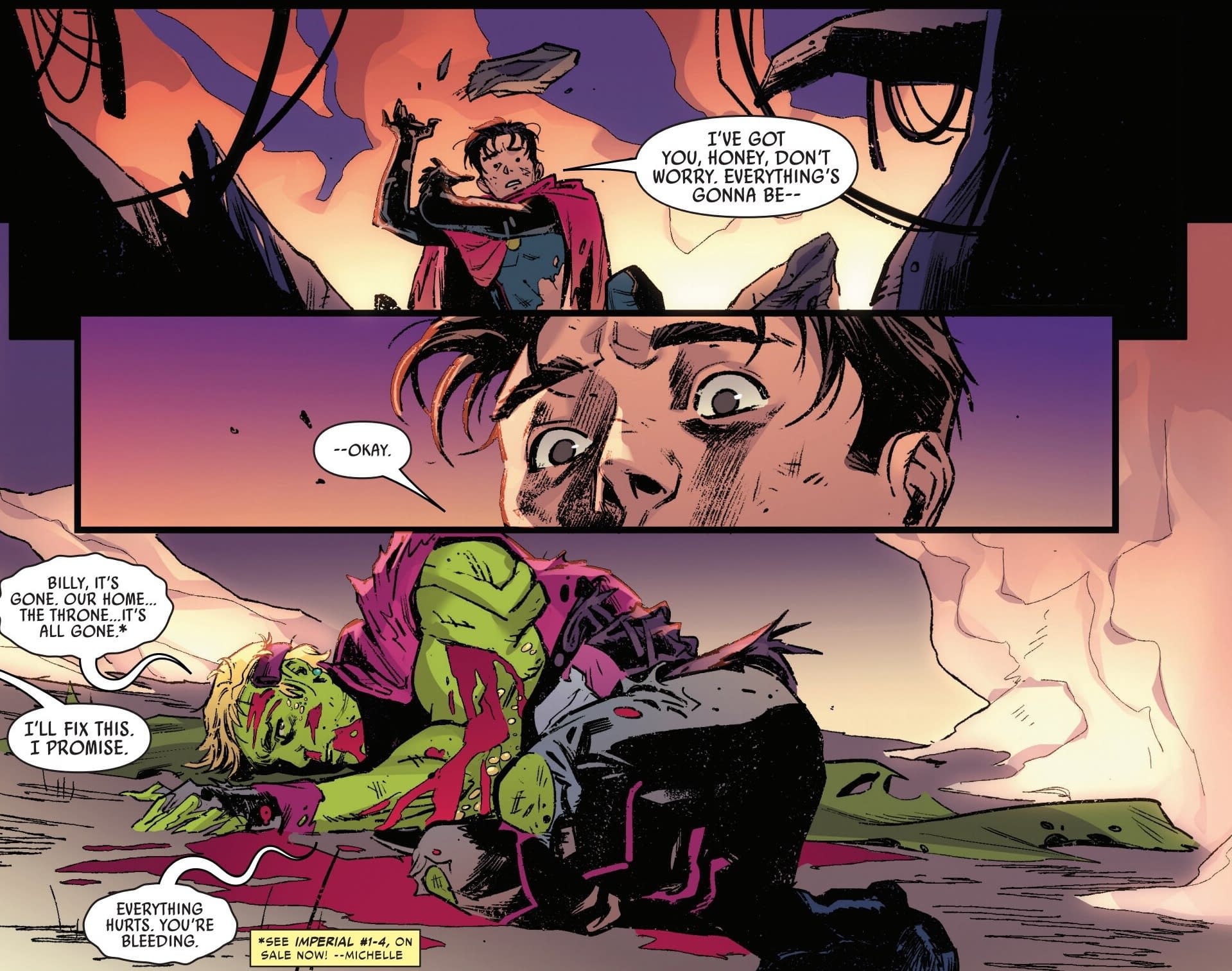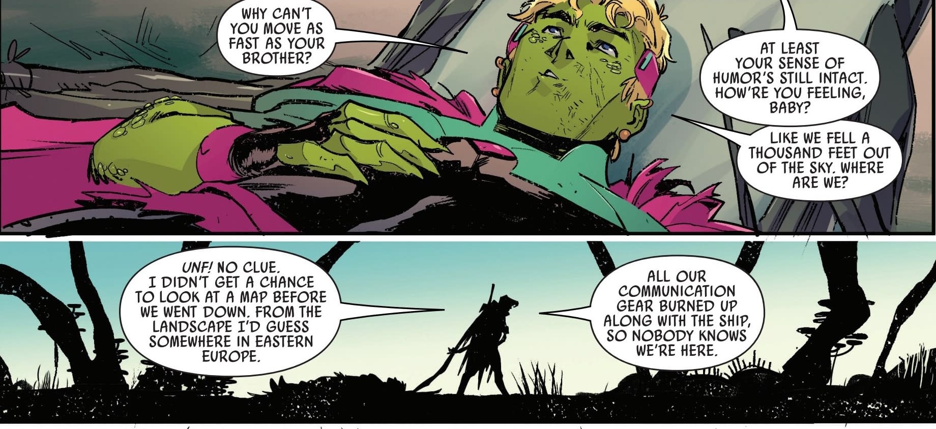 Spoilers! Spoilers! Spoilers! Wiccan: Witches' Road #1 by Wyatt Kennedy, Andy Pereira and Miles Morales: Spider-Man #41 by Cody Ziglar, Marco Renna are both published by Marvel Comics today, both with characters crash-landing from their Imperial-related antics a galaxy away. First with Billy Kaplan, Wiccan, escaping from the collapse of the Skrull/Kree Alliance in Wiccan: Witches Road.