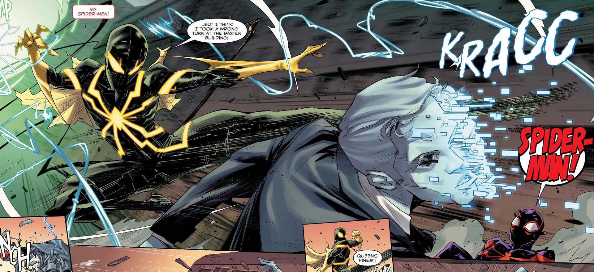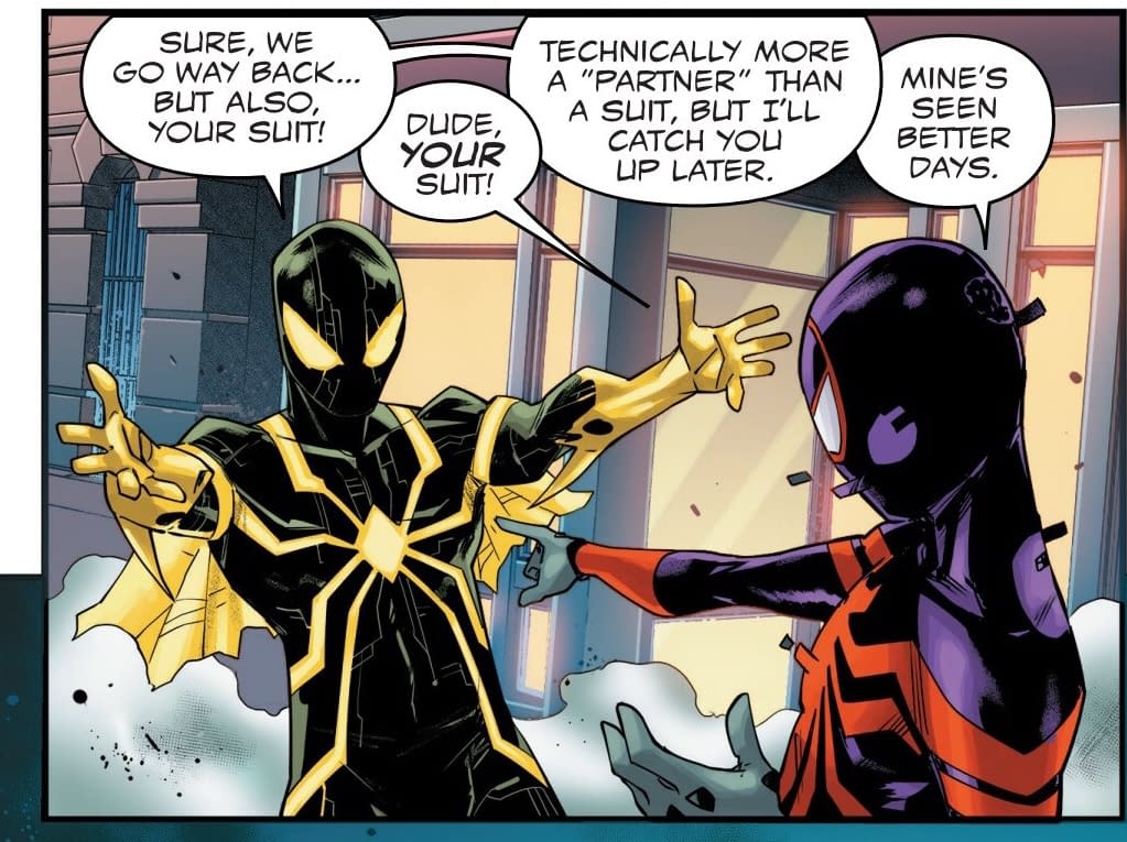 Peter Parker, back on Earth, and not even via his Amazing Spider-Man series. And not rushing off to find Mary Jane, but joining the fight alongside Miles Morales, who has been rather injured.