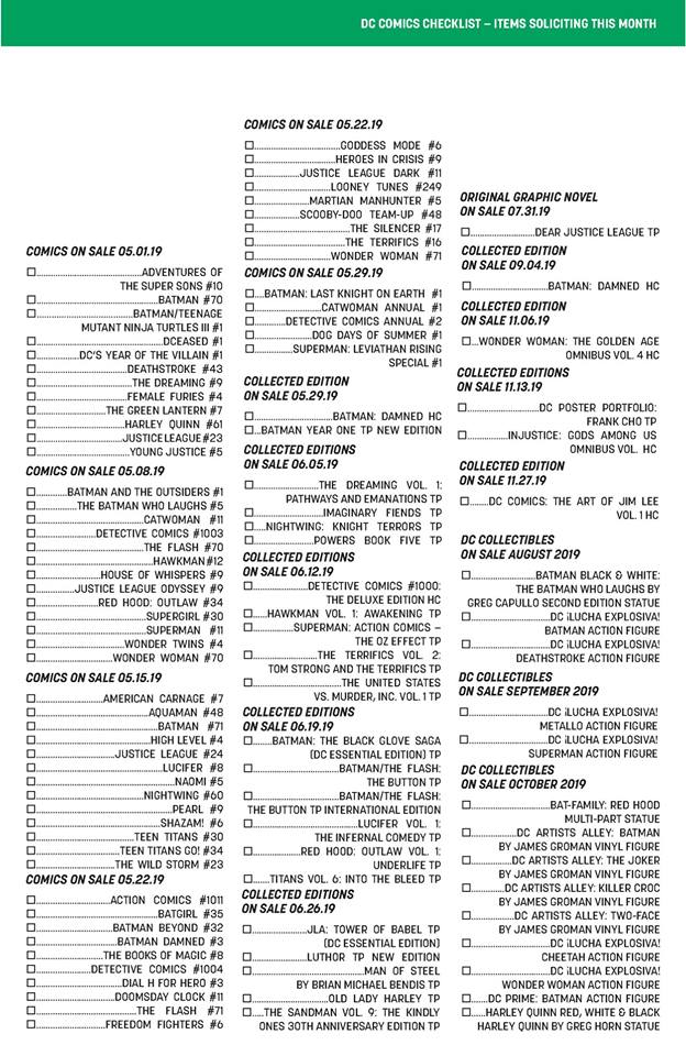 Bleeding Cool has the almost-full DC Comics May 2019 Solicitations – the comics, the collections and the collectables. We'll break these down into individual pieces today, I'm sure, and watch when Newsarama go running to DC saying 'Bleeding Cool have run the solicits, can we please be allowed to run them now as well?'