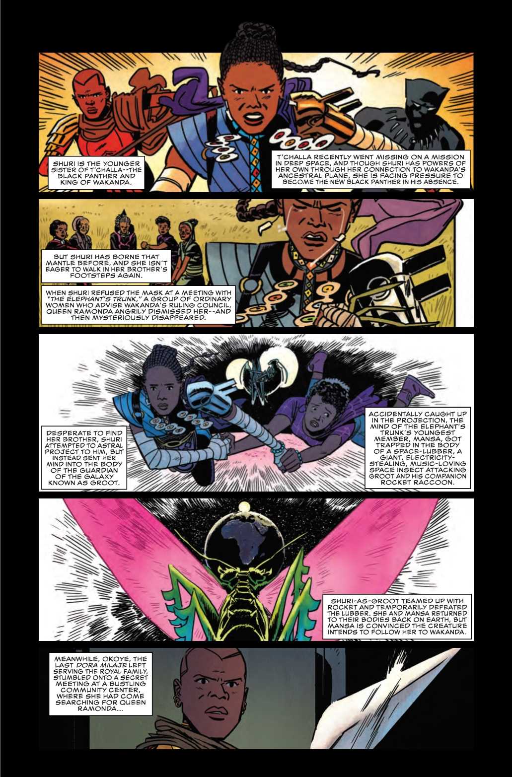 Shuri's returned from her space adventure with Rocket and Groot – but she's brought something back with her. And now, centuries-old music and stories are disappearing across Africa. Something is stealing the continent's cultural history – and its electrical power. Then, as if the heir to the throne didn't have enough on her plate, a mysterious envoy arrives, and they're looking for the Black Panther. Life as the princess of Wakanda just got a lot more complicated!