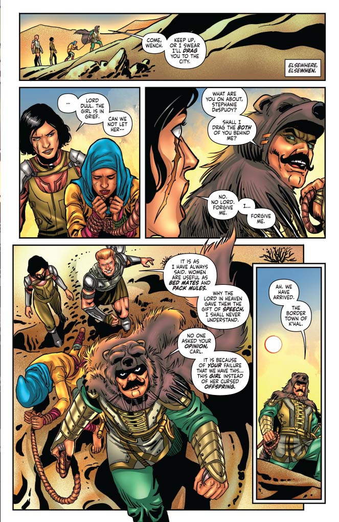 We saw in issue one, Eson Duul isn't just a complete bastard, but he's also racist, in a coldly unabashed and institutionalized way. He doesn't like people different from him. He doesn't like people LIKE him, either, but he's bought into a really virulent strain of racial hatred, so every comment from him reflects that entitlement. We saw some of this in the work of ERB now and then, so this is meant to resonate with that, and not any current political movements. But that's the thing, garbage finds a new face for each generation.
