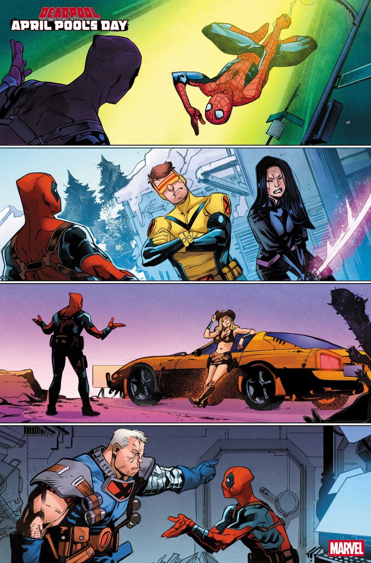 The DEADPOOL: APRIL POOL'S DAY #1 preview opens with just another ordinary day for Wade Wilson. He snoozes his Spider-Man alarm clock, he checks his Jeff the Land Shark calendar, and makes himself a cup of coffee all before deciding which weapon of mass havoc he's going to mess around with for the day. And then seemingly out of nowhere, Deadpool finds himself in a rom-com. He tries to rally Spider-Man and the X-Men to stop the threat he's uncovered, but to them, it's just another prank. Follow the Merc with a Mouth as he romps through genre and reality!