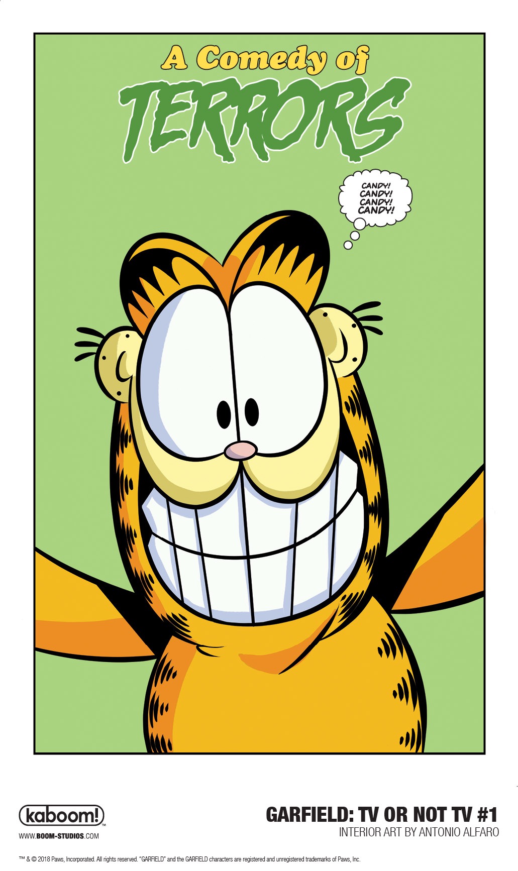 In "Comedy of Terrors," the fan favorite Garfield: Homecoming team of writer Scott Nickel and Antonio Alfaro reunite for a frighteningly fun Halloween tale, as a creature reaches through the television and into Jon's living room. Luckily, Garfield is as brave as they come…oh, wait.