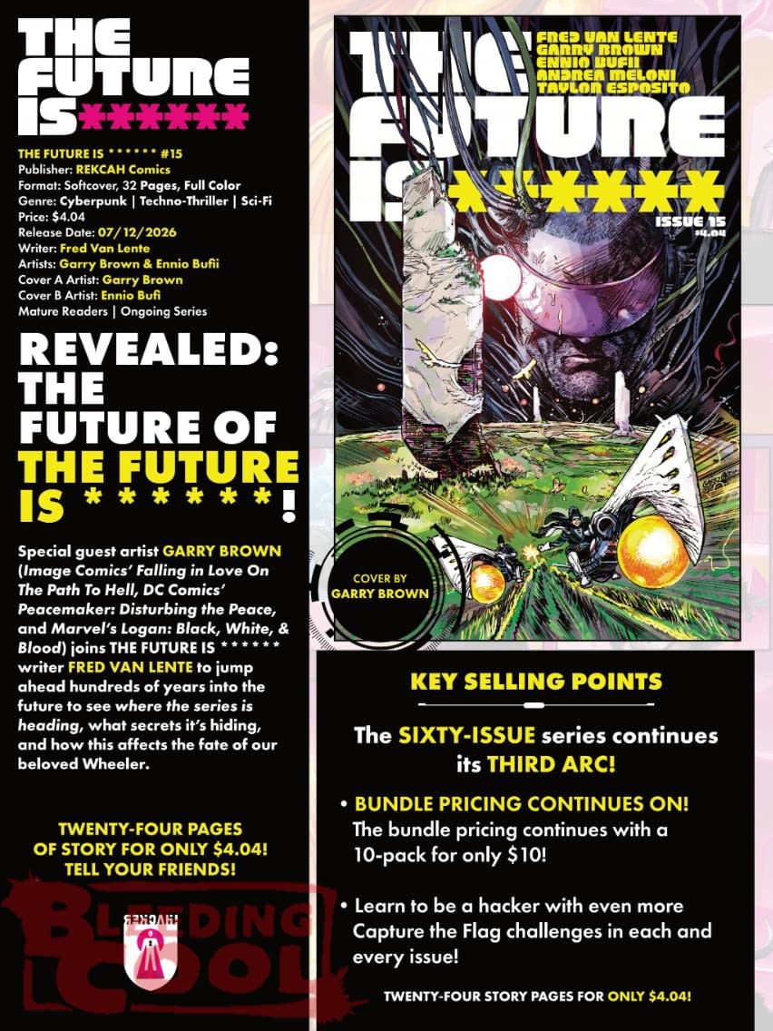 - Garry Brown joins The Future Is **** #15 as guest artist in Rekcah Comics’ July 2026 solicits, teaming with Fred Van Lente.