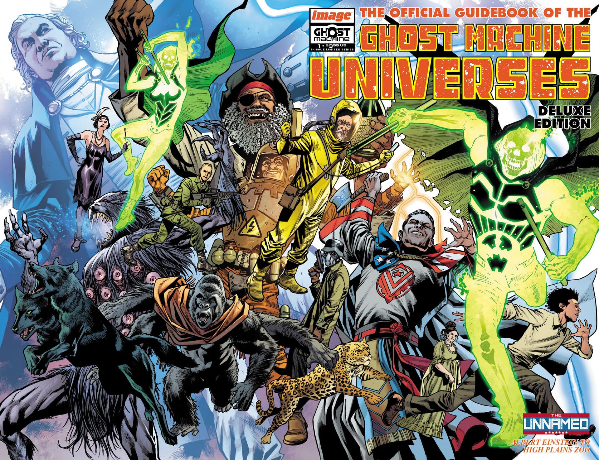 How hot does Geiger burn? What is the Committee on Spectral Affairs? Did George Washington really die? This new limited series collects all-new entries teasing tantalizing stories to come, as well as updated goods on Ghost Machine's characters from across its hit titles beginning with The Unnamed Universe from GEIGER, JUNKYARD JOE, and REDCOAT! With interior character art from Ghost Machine's all-star artists, don't miss the outstanding classic homage covers that let you decide what '80s inspired guidebook look you want to collect! This initial volume covers the first half of the world of The Unnamed from Albert Einstein to the High Plains Zoo!