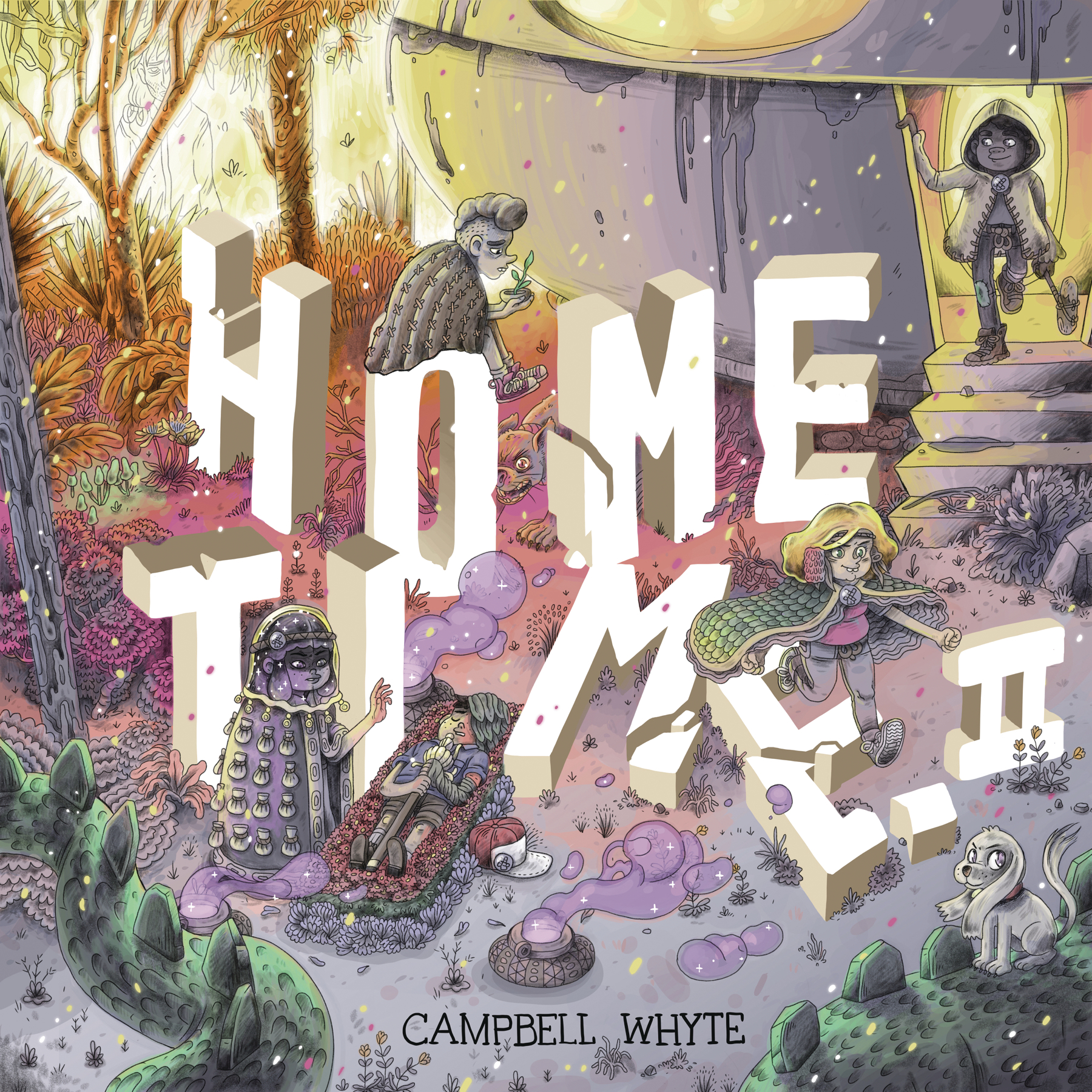 Home Time: Under the River ended with a disastrous tea ceremony which left six kids lost, scared, confused, and even burnt. Now, the second half of the Home Time saga picks up from that nerve-wracking cliffhanger, as the children leave the relative safety of Peach Village in search of medicine, answers, and, hopefully, a way home. Equipped with a living map, a flask of hallucinogenic tea, and a plan so stupid it just might work, Lily, Amanda, Ben, and Nathan will have to pull together at the very time they've drifted the furthest apart. Award-winning graphic novelist Campbell Whyte is back, with his signature kaleidoscope of art styles, to cast a new spell wrapping up the most whimsically fantastical journey in ages.