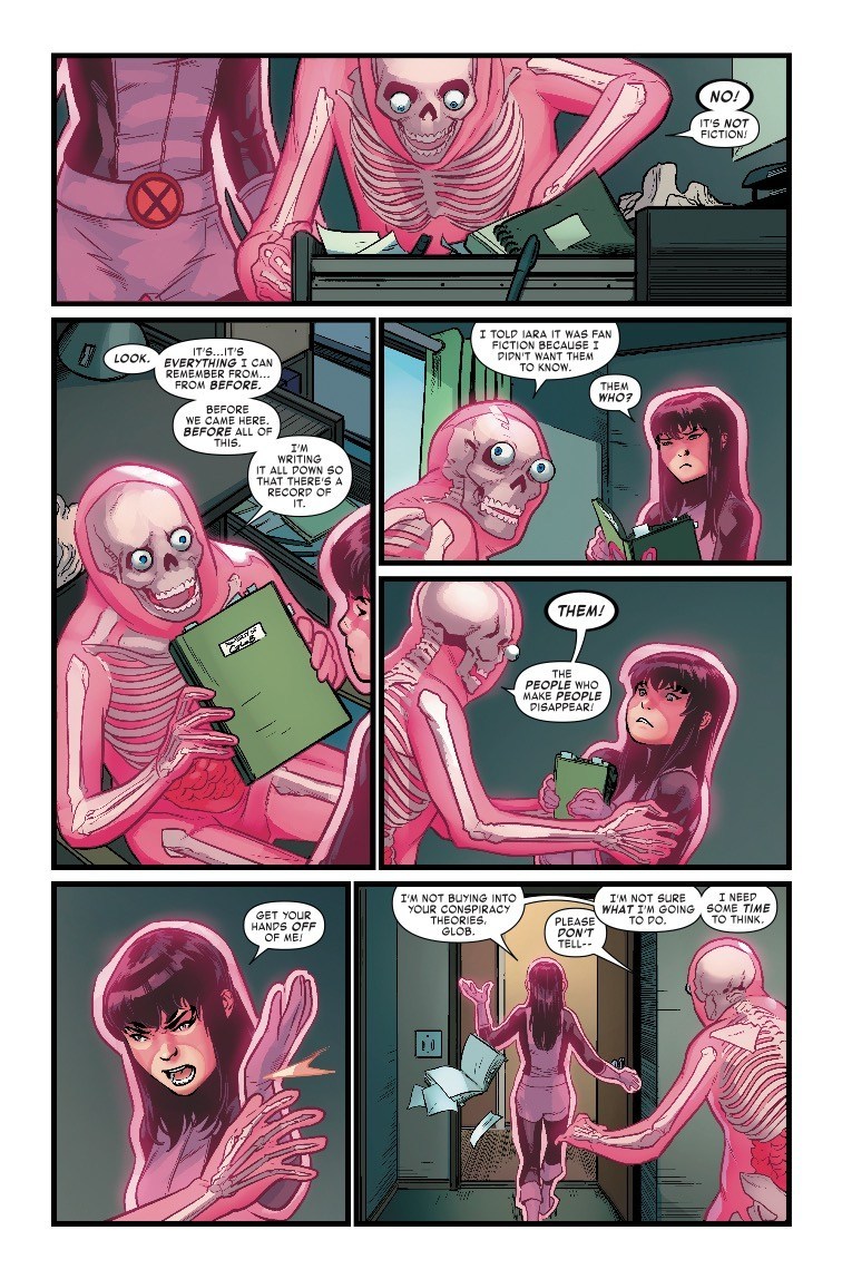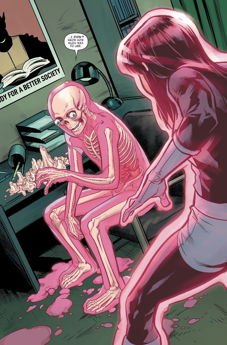 At the end of the previous issue of Age of X-Man: NextGen, Glob Herman was about to reveal a secret to Armor. In this preview for next week's NextGen #2, Glob has apparently… er… melted his wax flesh all over her? Ew. Apparently, this was necessary in order for Glob to share his secrets with her.