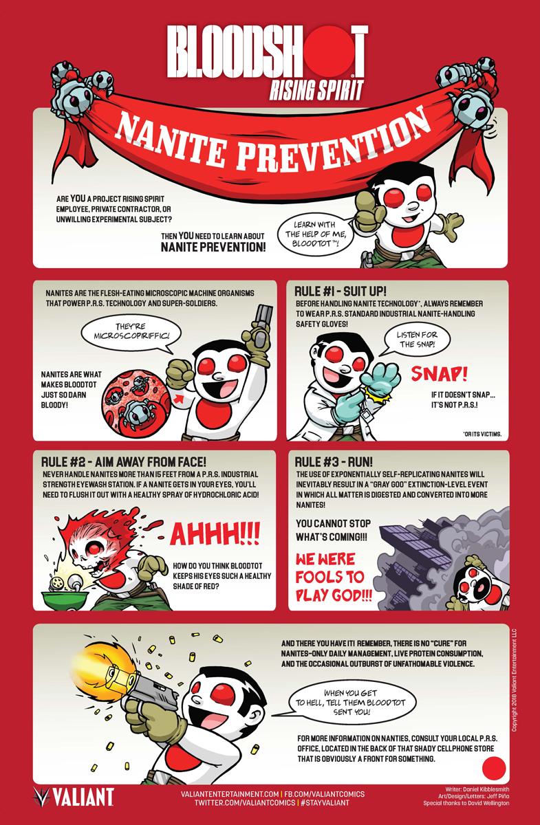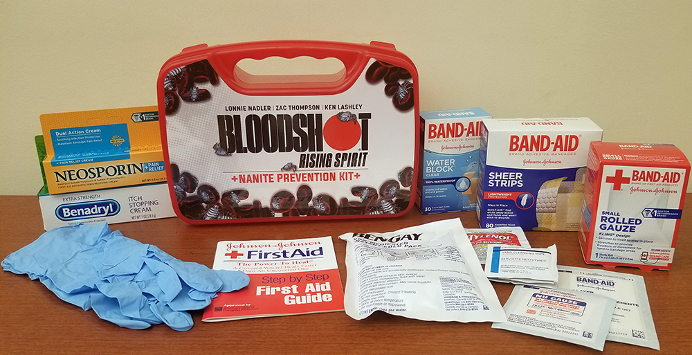 A Comprehensive First-Aid GuidePlus, the kit also comes with the BLOODSHOT RISING SPIRIT NANITE SAFETY GUIDE, a fold-out poster with prevention tips written by comedic talent Daniel Kibblesmith (QUANTUM AND WOODY!, VALIANT HIGH, Lockjaw) and illustrated by eye-popping artist Jeff Piña (Dr. Oblivion's Guide to Teenage Dating)!