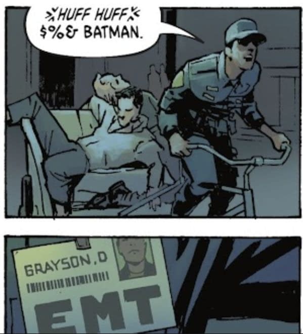 Maybe he does. Bleeding Cool pointed out back in Absolute Batman #9, one Dick Grayson as an EMT driving one of the criminals of Gotham City traumatized by Batman, while cursing him out. What if Dick Grayson becomes… The Joker's Robin.