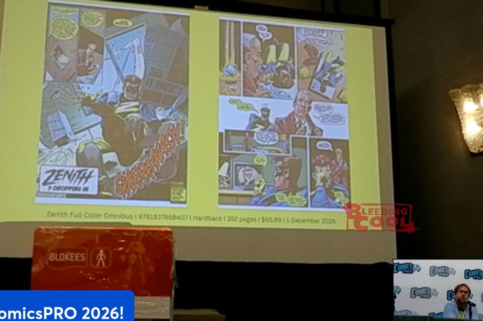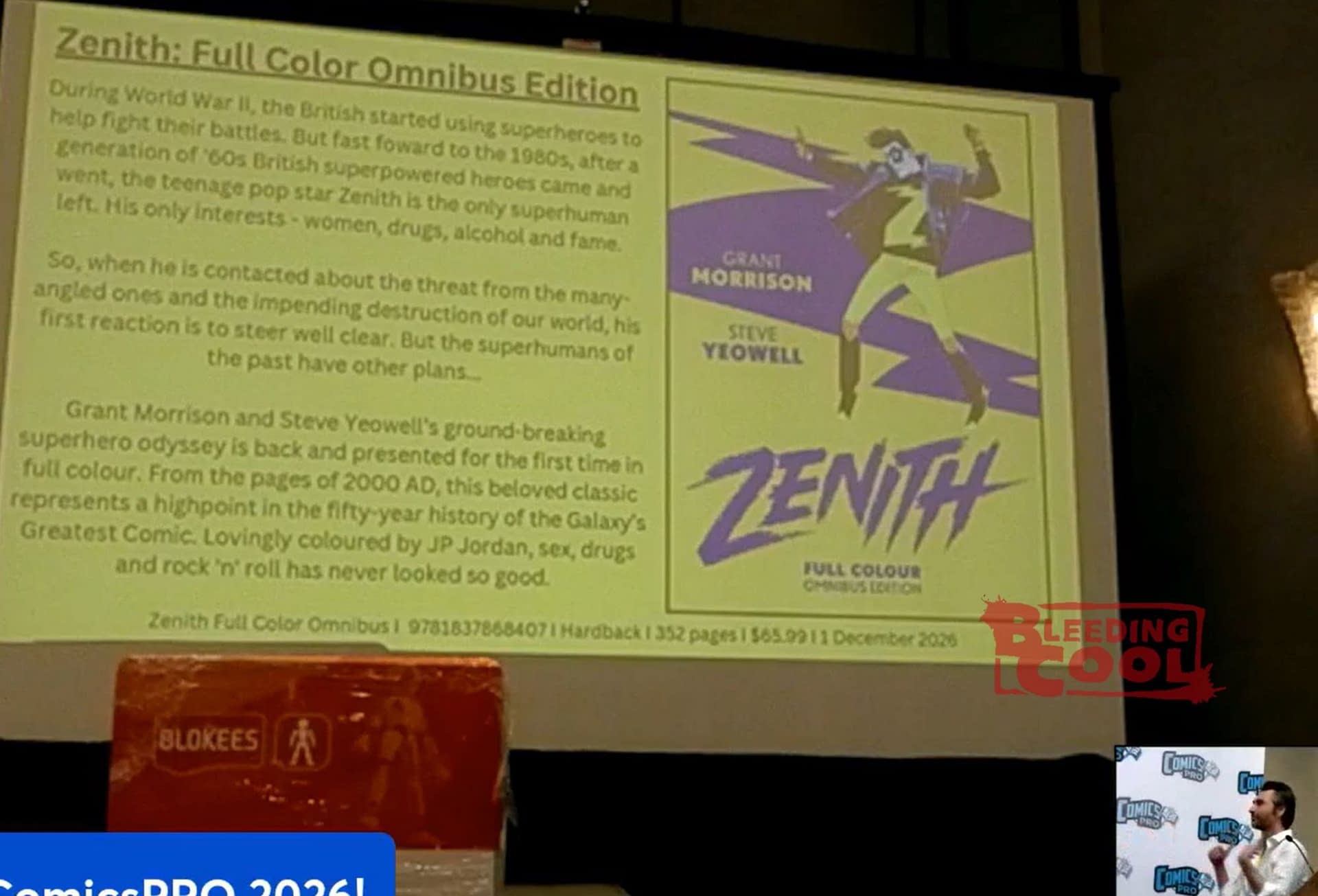Owen Johnson, Rebellion Publishing Sales Manager, told the throng, "This is Grant Morrison's first ever superhero epic. He did this with us back in the day. It's complete and in colour for the very first time. We' ve got colour artist JP Jordan to take a crack at it in the manner of the Halo Jones Omnibus that we constantly have to keep in print as a complete volume." Steve Morris, Rebellion Publishing Marketing Manager, added, "Most superheroes are selfless, heroic, self-sacrificing. Zenith is a prick. He is a young, bratty 1980s Gen Xer who doesn't want to do anything to help the common man; he's also a world-famous popstar, so basically, imagine Justin Bieber going absolutely crazy with superpowers. This is Grant Morrison going weird right off the bat, it goes into Multiverses, Nazi superheroes, weird stuff drawn by Steve Yeowell, who would become a cornerstone of Vertigo." Johnson concluded, "It's the beginning of a remarkable career. It really is a masterpiece"