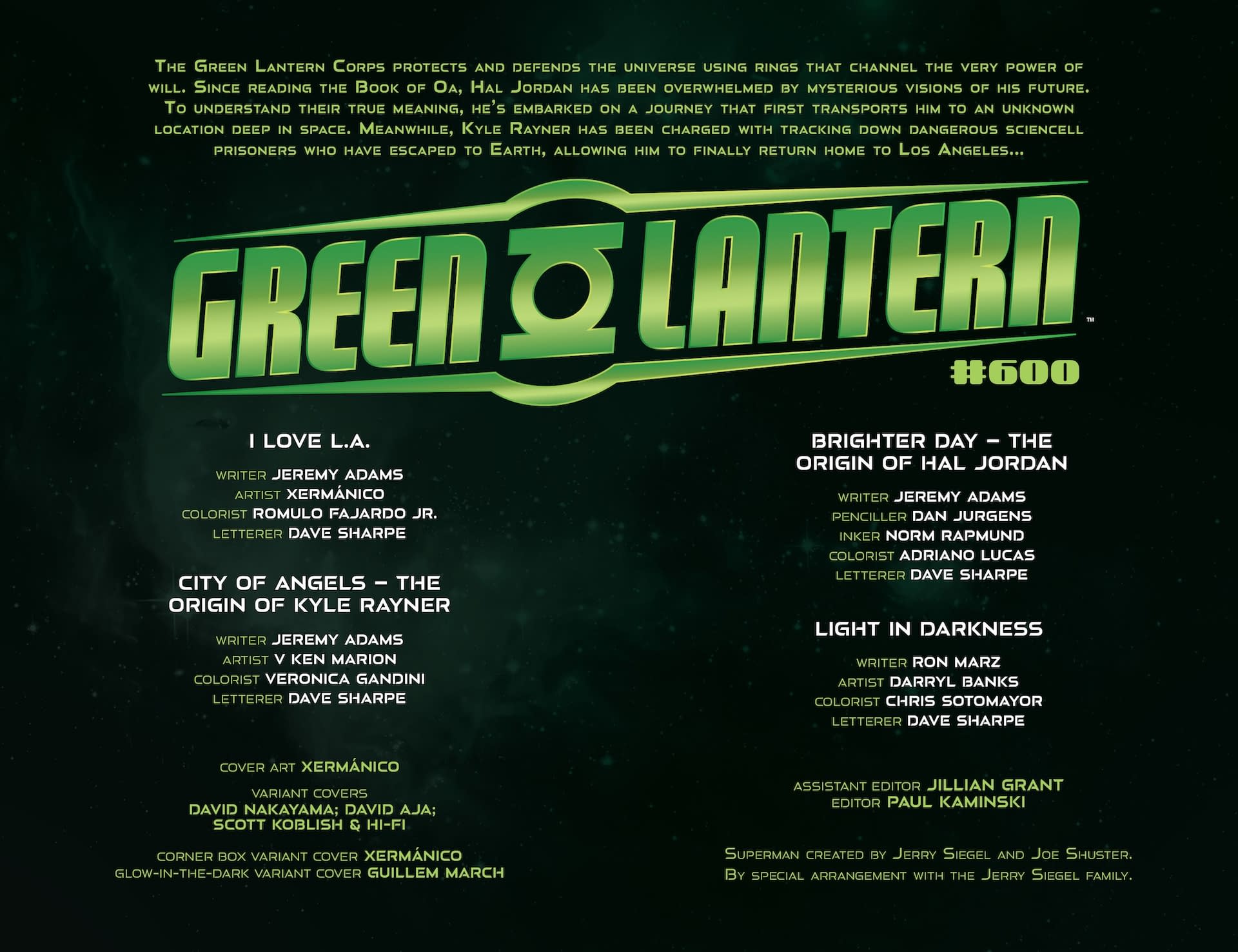 KYLE RAYNER LEADS THE NEXT CHAPTER OF THE GREEN LANTERN MYTHOS STARTING HERE! CELEBRATE 600 ISSUES OF GREEN LANTERN WITH EPIC STORIES, LEGENDARY CREATORS, AND NEW COSTUMES DESIGNED BY SUPERSTAR ARTIST DAVID NAKAYAMA! In this special, oversize 600th issue, Hal Jordan will be tested as never before…and a new Lantern stands poised to step in should he fail. Hal embarks on a mysterious mission while Kyle Rayner finally moves back to Los Angeles and again takes up the mantle of Green Lantern of Earth. Join Kyle as he finds a job, navigates traffic, and chases down escaped villains from Oa! All this, plus a host of legendary guest artists and writers from Lanterns past, and an answer to the question posed to Star Sapphire in the last issue…