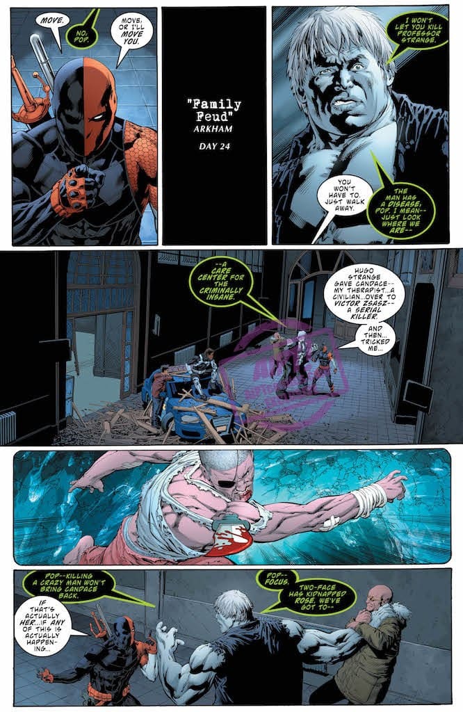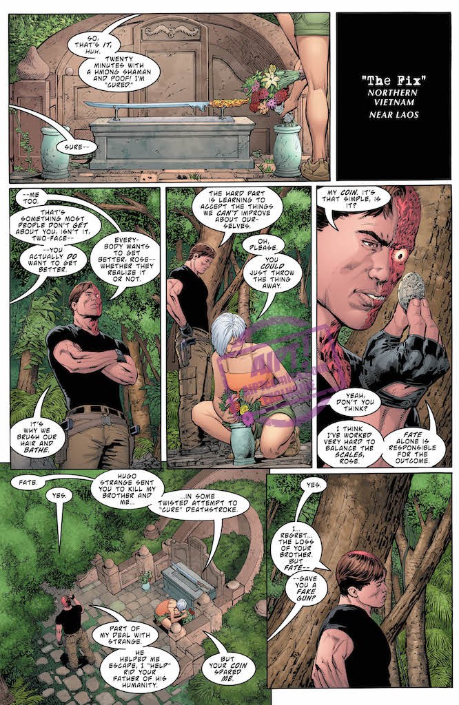 Deathstroke's son Jericho breaks into Arkham Asylum in an effort to free him, but Slade Wilson is caught up in his own conflict with the return of Dev-a.k.a. "Death Masque"-and the realization that his hallucinatory trip into outer space may have been more real than previously advertised! Meanwhile, Two-Face has Rose dead to rights-is there anyone left to save her?