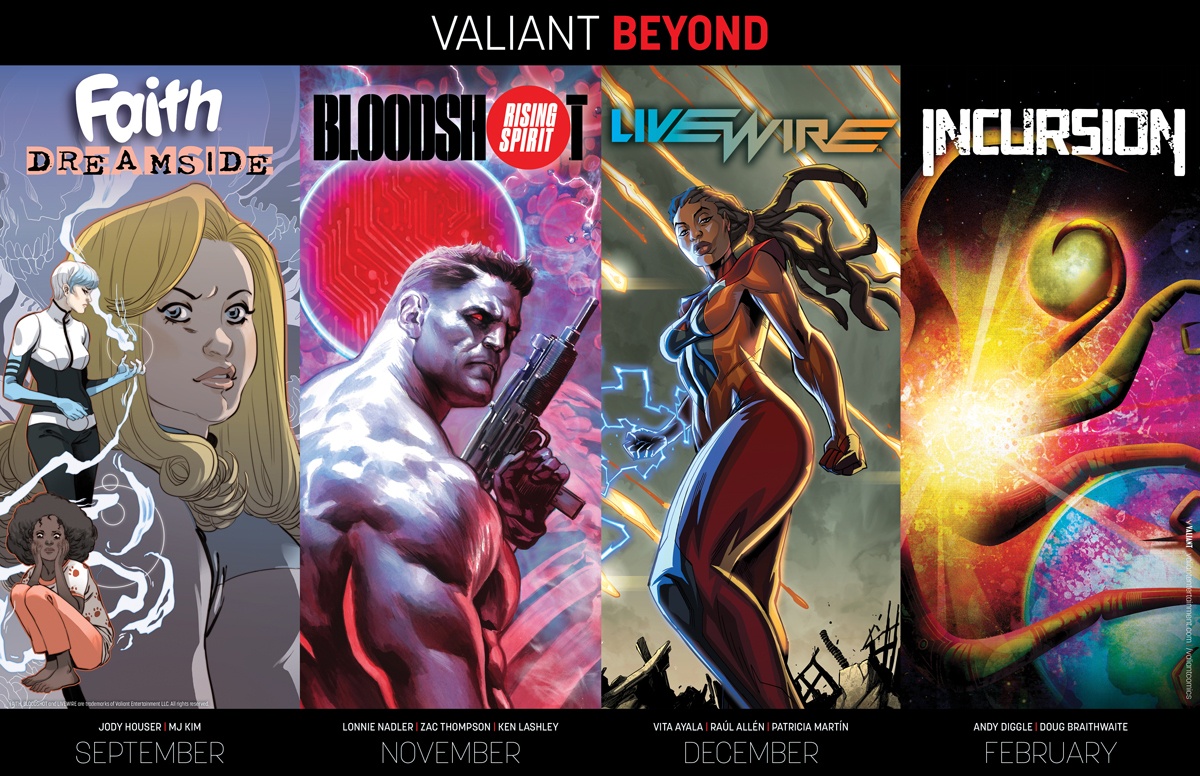 Once the dust of HARBINGER WARS 2 has settled, BEYOND will round out the end of Valiant's 2018 publishing schedule and drive forward into the new year with FAITH: DREAMSIDE #1 in September; BLOODSHOT RISING SPIRIT #1 in November; LIVEWIRE #1 in December; and INCURSION #1 in February 2019!