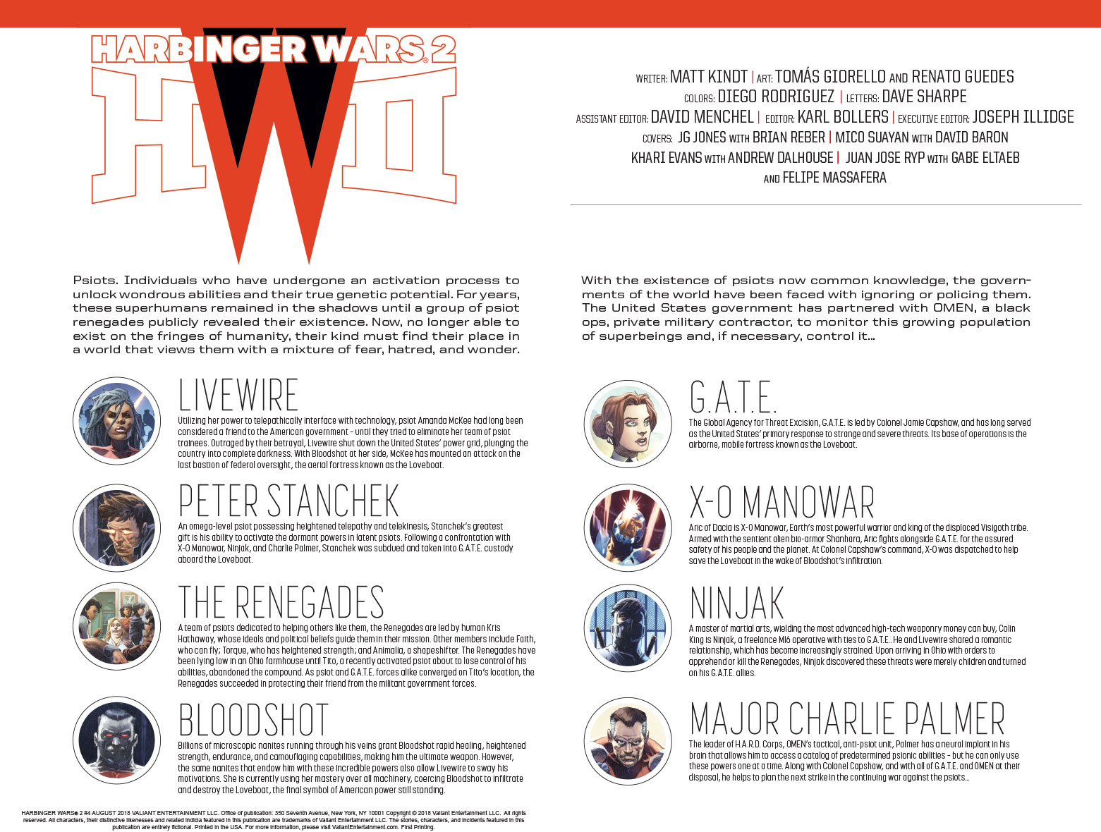 Valiant is releasing two comics this week, but only one is the epic finale to the super-mega-crossover event of the summer. Harbinger Wars 2 #4 is in stores on Wednesday, as well as X-O Manowar #18. Check out the previews below.