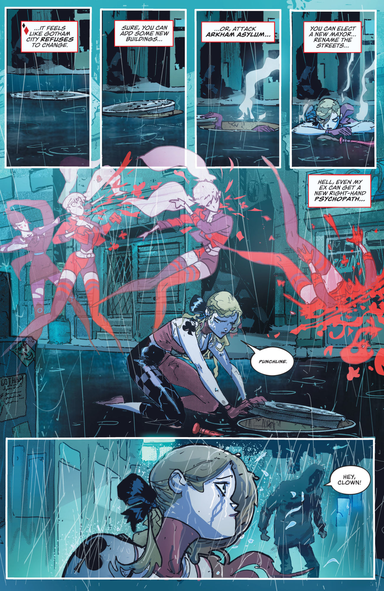 Ahem! You better read this closely, 'cause we've got a red-hot relaunch on our hands here—and I should know! Harley Quinn here to let everyone know that I got a brand-new monthly series here with a brand-new status quo. I'm coming back to Gotham City to make up for the sins of my past, and help the city recover from "The Joker War"!