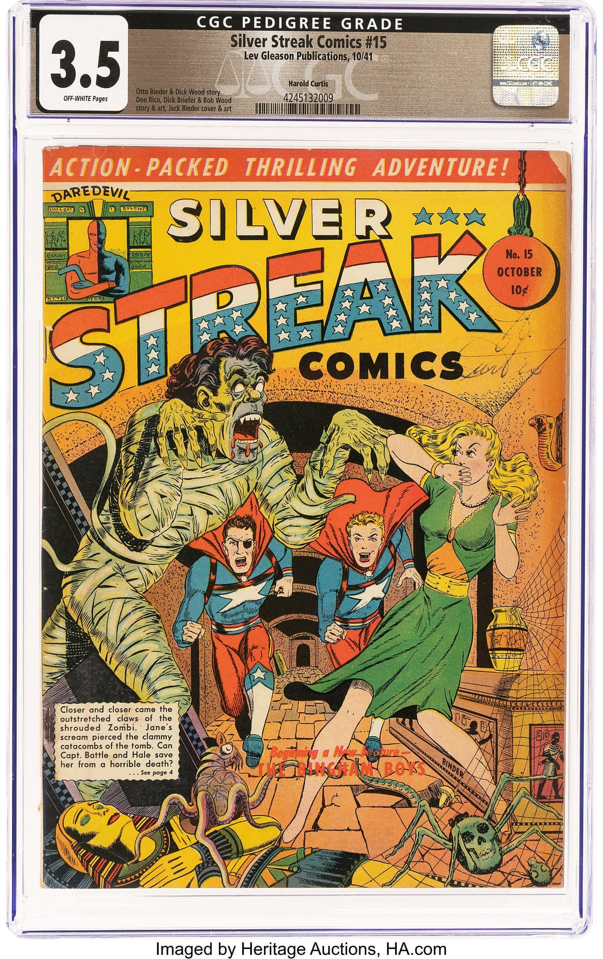 The CGC census lists only 23 Universal entries, with a single 8.5 at the top, one 8.0, and then a drop into the 7.0s, and then a cluster in the Good to Fine range. The unusually thin population at the top makes the mid-grades all the more desireable, as does the Harold Curtis pedigree itself. A pedigree copy of an early issue of a foundational Golden Age superhero series, there's an Silver Streak Comics #15 (Lev Gleason, 1941) Harold Curtis Pedigree CGC VG- 3.5 Off-white pages up for auction at the Golden Age Comics Century Showcase Auction IV.