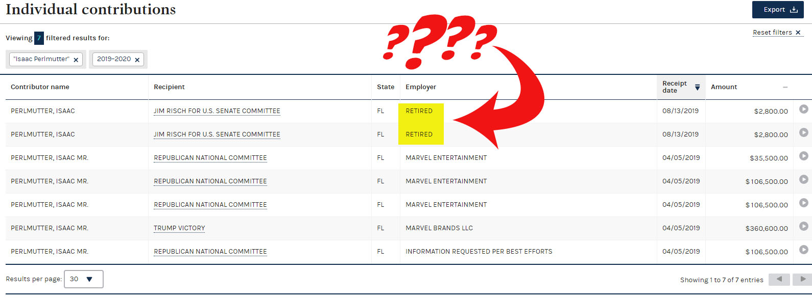 Is Marvel Chairman Ike Perlmutter trying to slink off quietly into the night? Bleeding Cool has long reported on Perlmutter's donations to Republican political candidates, in particular to the campaign of President Donald Trump. But in our latest routine check of who Perlmutter is giving money to, we found an interesting entry in the "employer" column, listing Perlmutter as "retired."