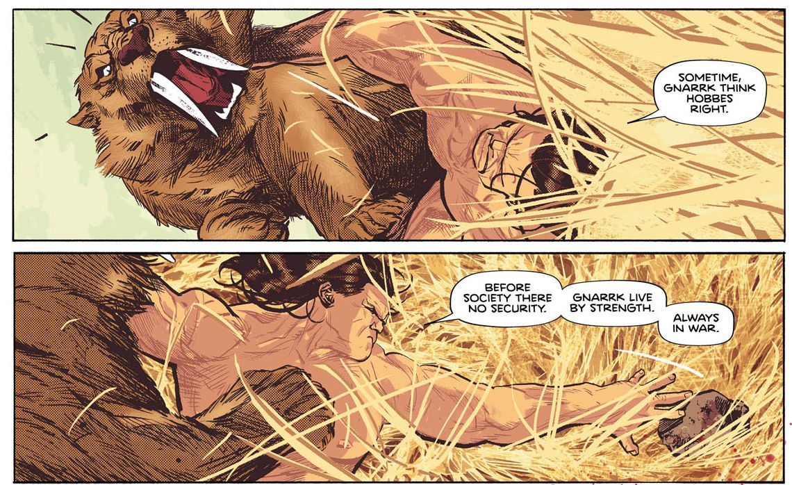 Sorry, wrong clip there. Twenty-three years old that one. Sniff. Still, Heroes In Crisis #6 does have Gnaark the Caveman fighting a tiger while quoting Hobbes.