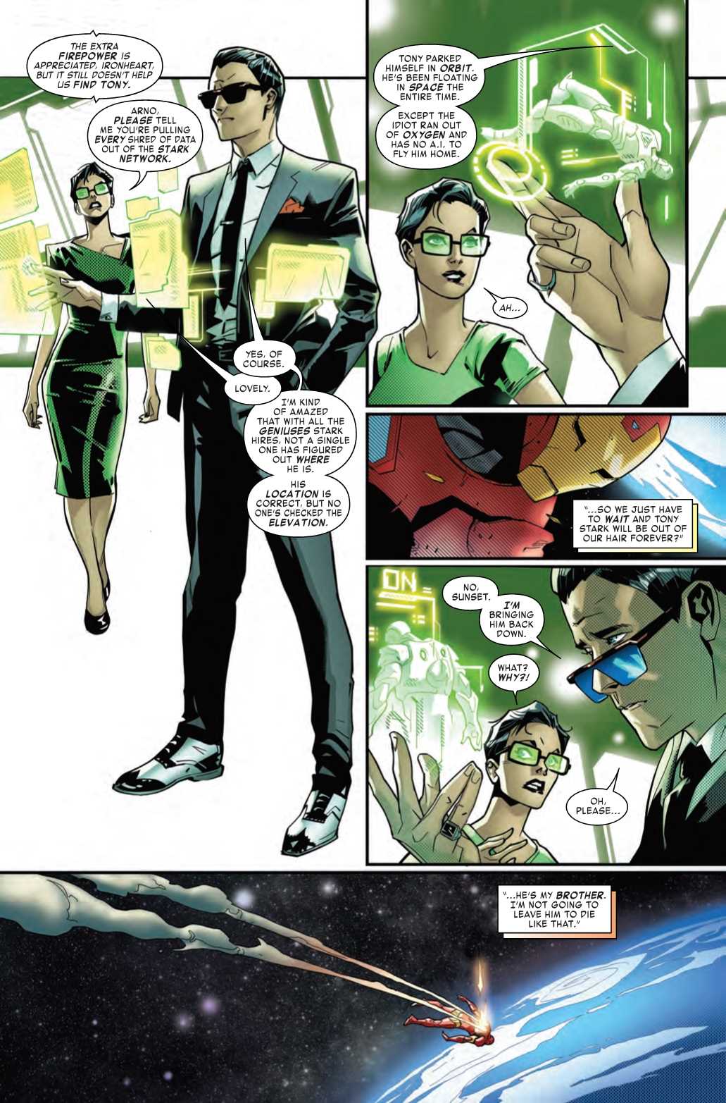 Thankfully, Tony's brother Arno is there to save the day. He's located Tony, floating in space, having run out of oxygen and apparently passed out. It's the perfect opportunity to do away with him once and for all.