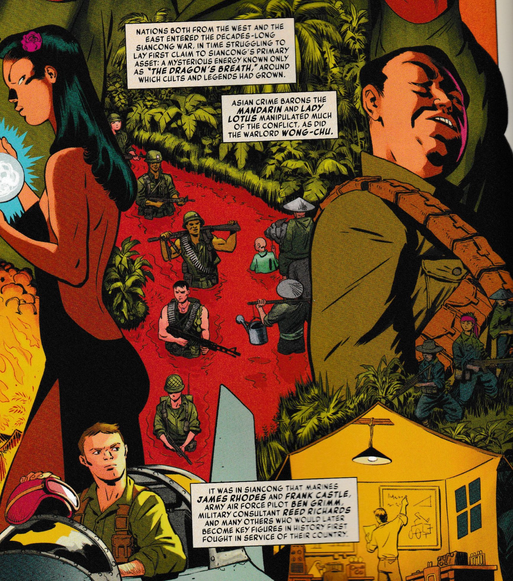 The Siancong War – originally the SinCong Conflict in Marve Comics continuity – a Vietnam/Korean War analogue from early issues of The Avengers, then shown as a revolution against the French Empire in the eighties, looks like it will now be the place of conflict for The Thing, Mister Fantastic, War Machine, The Punisher and anyone else who needs such an event in their story. And, since it is a fictional war, it can slide down the timeline along with everything else. And The Dragon's Breath as the MacGuffin from New Warriors, originally meant to be from Cambodia, that seems to have fuelled such conflicts – as well as now being behind the power bases of plenty of the yellow peril bad guys of the 60s and 70s, including The Mandarin and Lady Lotus.