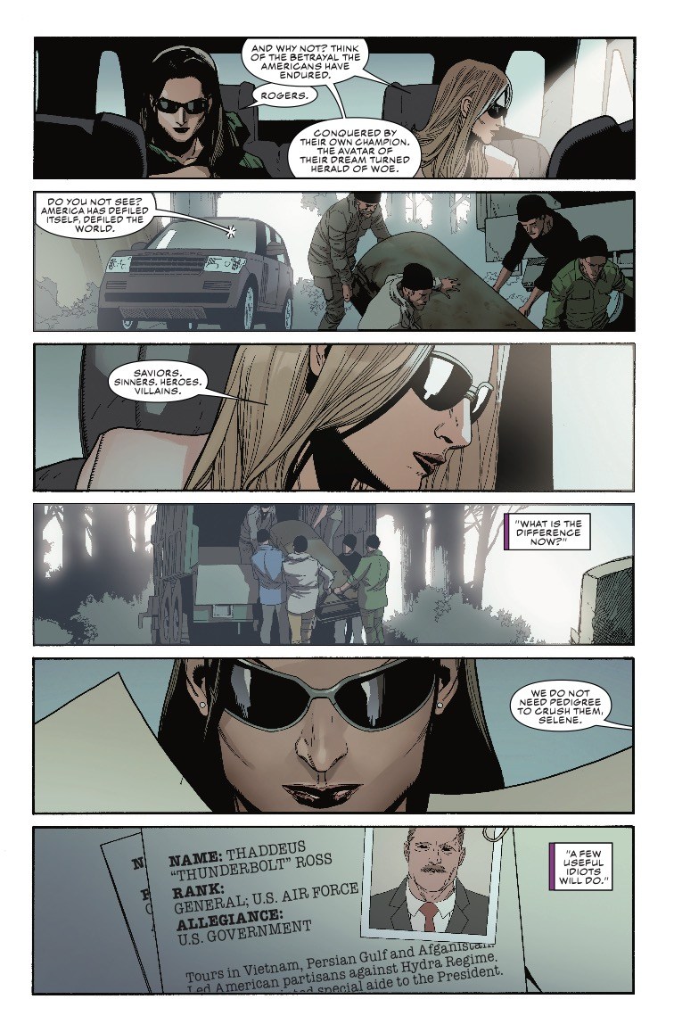 In next week's Captain America #5, the power elite continue to advance their plans for world domination, made easy thanks to the public's loss of faith in America thanks to the actions of Nazi Captain America in Secret Empire. As Selene and Alexa Lukin discuss their plans in the preview below, however, we begin to wonder whether we're talking about the fictional Marvel Universe, or our own.
