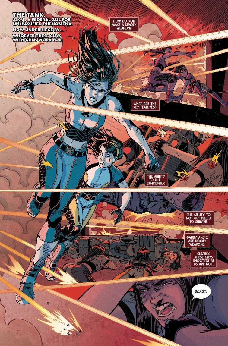 The clone sisters have found themselves in quite a conundrum in next week's X-23 #8. Having captured an assassin who appears to be a cyborg version of a genetically engineered clone from the same DNA source as them, they've brought her to supervillain prison The Tank, only to see that prison invaded by mysterious soldiers in masks with guns (looking a little bit like Cobra Vipers, if we're being honest).