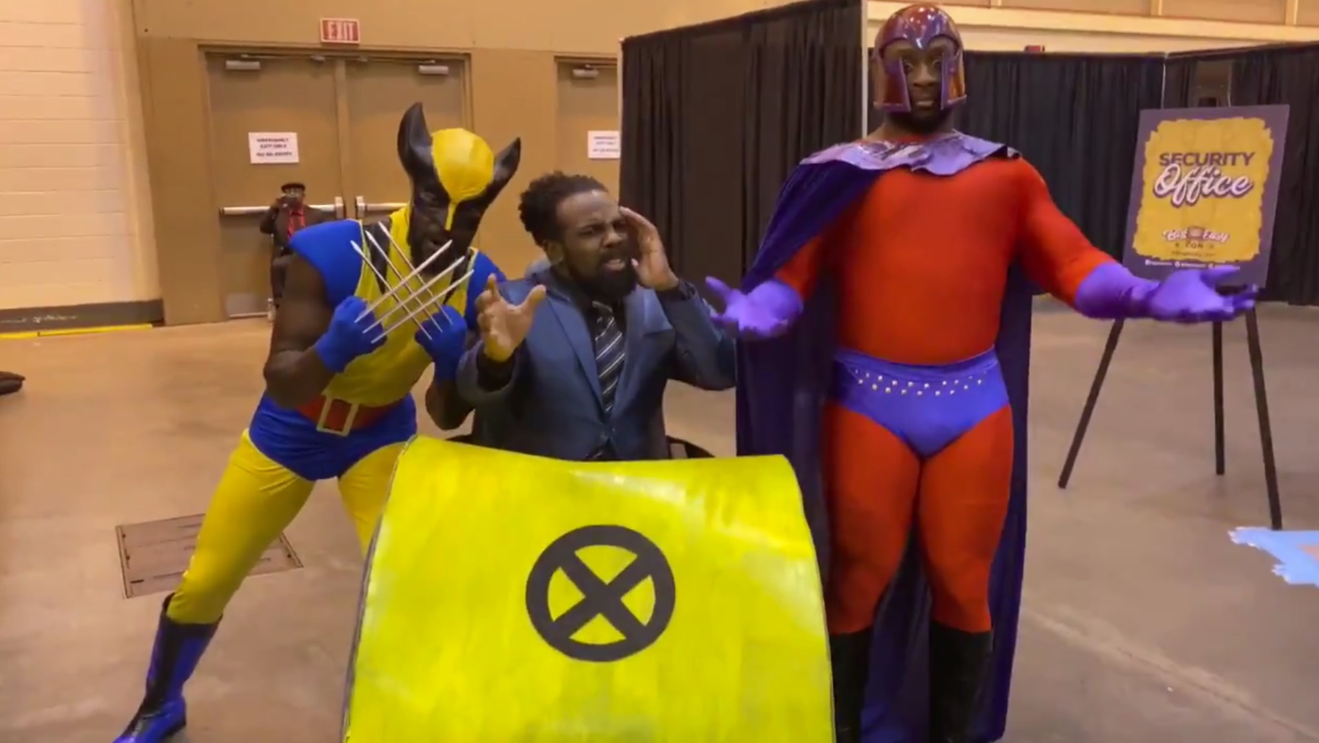 Since Woods needs a wheelchair to get around the convention, it makes sense that he would cosplay as Professor Xavier. Big E dressed up as the master of magnetism, Magneto, while Kofi Kingston donned some yellow spandex and claws as Wolverine.