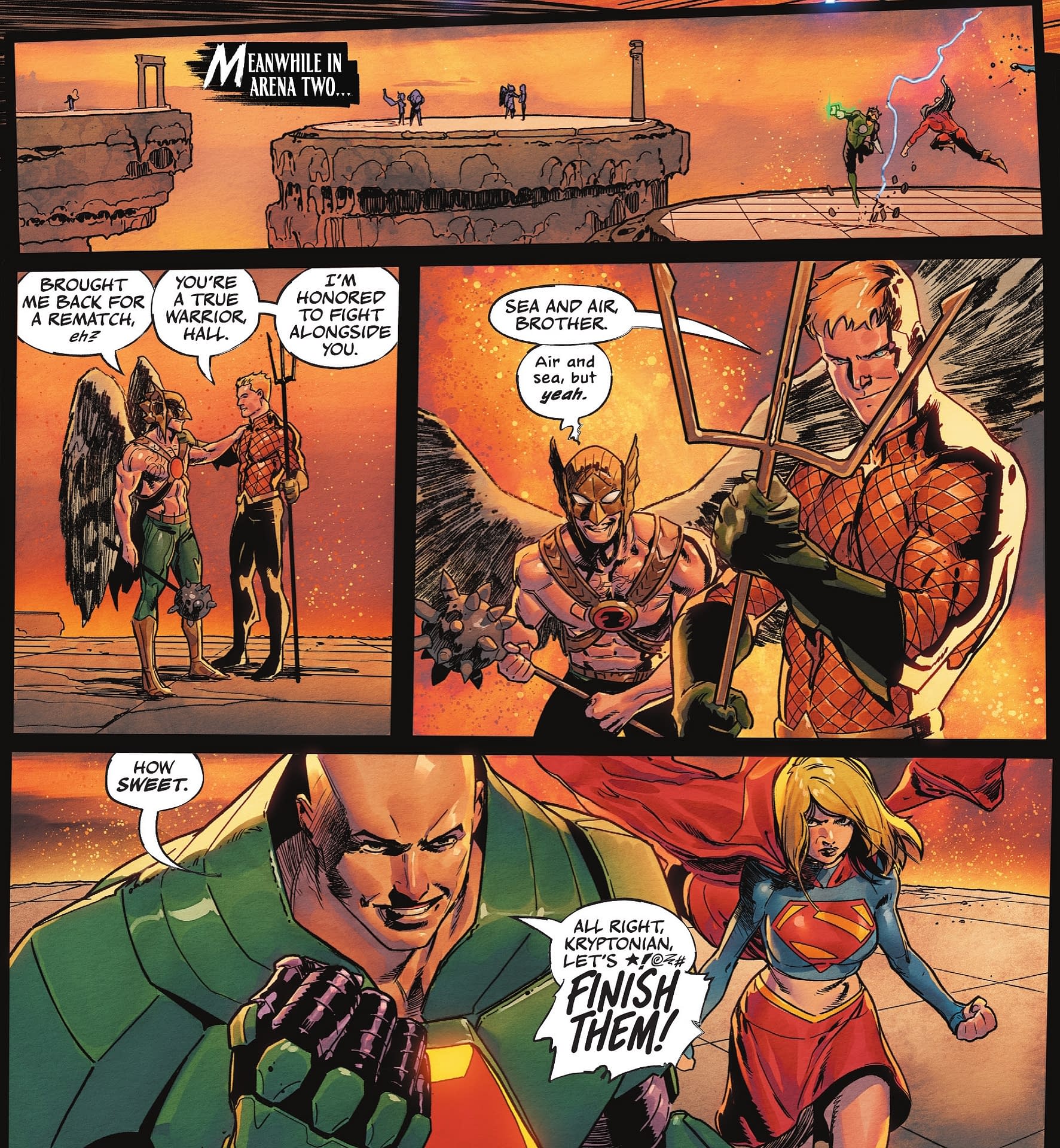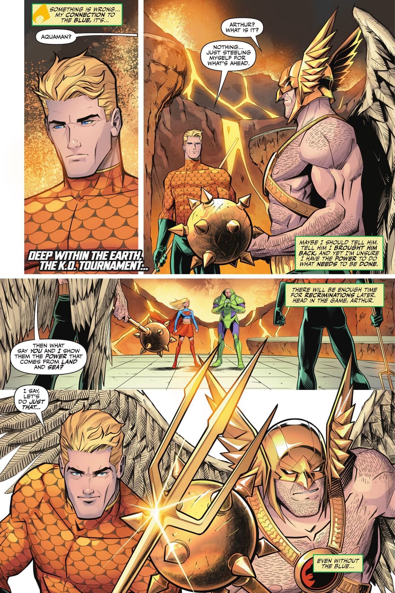 DC K.O. #3 by Scott Snyder, Joshua Williamson, Javi Fernandez and Xermanico and Aquaman #13 by Jeremy Adams and Daniel Bayliss are both published today from DC Comics. I've always liked to see how such series align, back each other up or differ when telling the same story. So as Aquaman chooses to revive Hawkman to assist him in his tournament fight, we see how that plays out today in both Aquaman #13… showing doubt in the face of adversary.