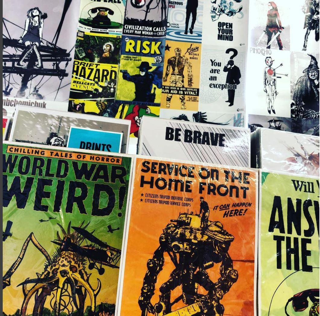 In order to do so, he began making prints of his comics. These, he would display prominently to fill the space of his booth, drawing walkers-by in. His particular style is a mix of graphic and text which looks ominously dystopian and foreboding. Perfect for 2018.