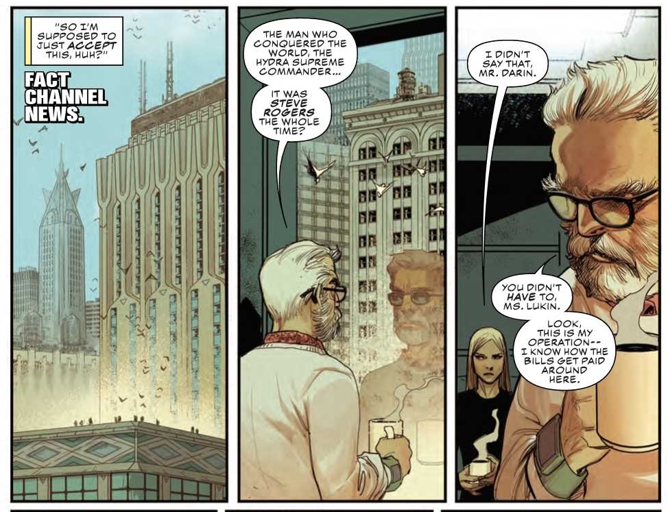Captain America #9 by Ta-Nehisi Coates, Adam Kubert, Frank Martin, Joe Caramagna, Carlos Lao, Shannon Andrews, Alanna Smith and Tom Brevoort has, as we have seen in previews, taken to Marvel's equivalent of Fox News, Fact News, being influenced by the Russian. But no collusion, right? Remember that.