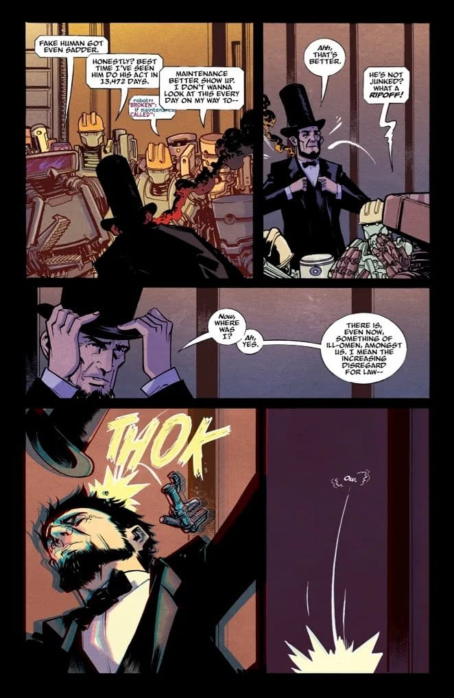 After the robot cops finally nab him, animatronic ABE gets hauled to the factory for a little "maintenance." But if he keeps yapping about humans, there ain't gonna be enough of him left to fix. They got a whole bag of dirty tricks waitin' for him—torture, mind-wipin', and magnets so mean they'll pull the thoughts right outta your skull. A strange and thunderous tale of the future—dark, mechanical, unforgiving and the sci-fi smash hit of the year. $4.99 6/17/2026