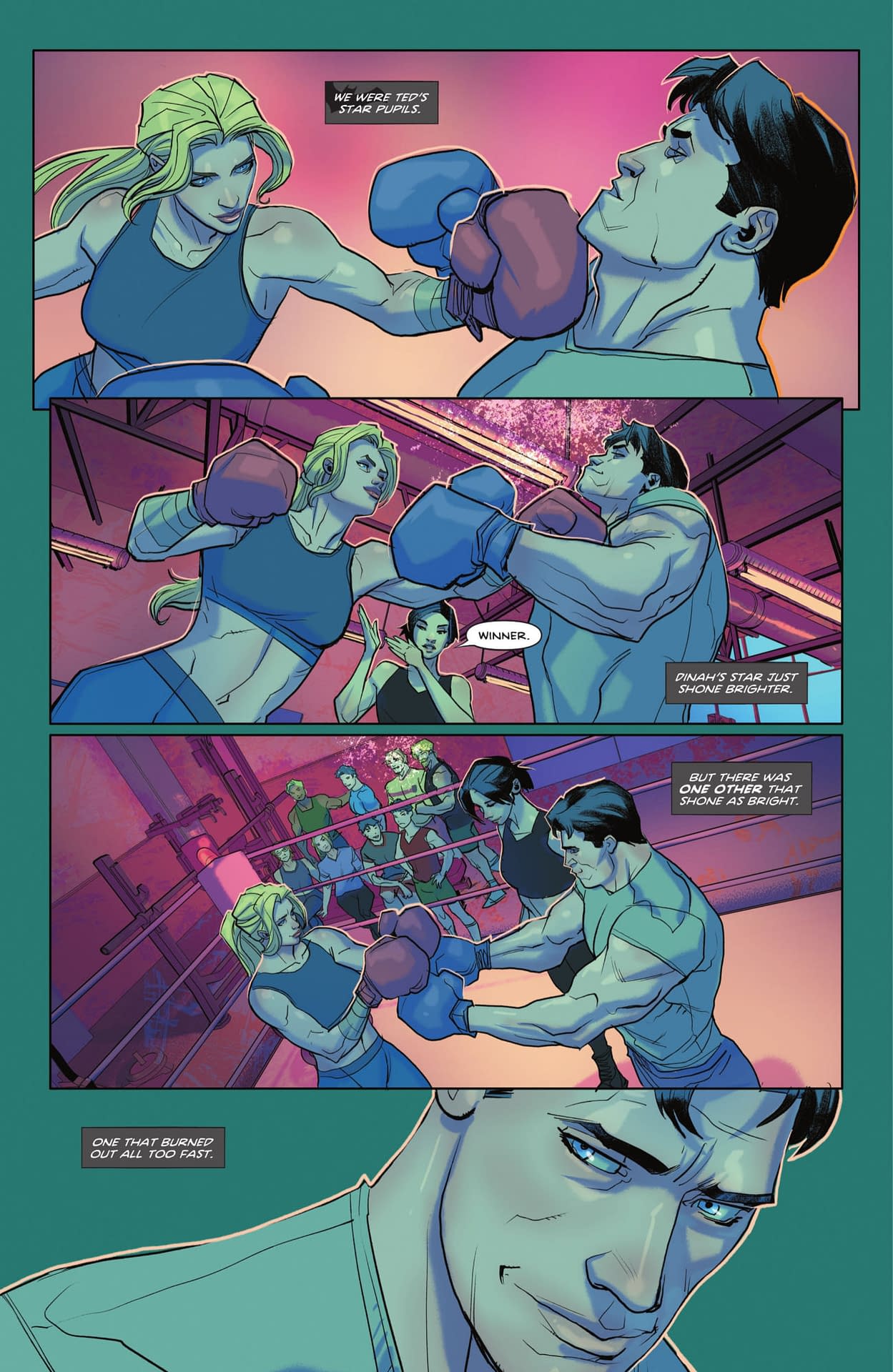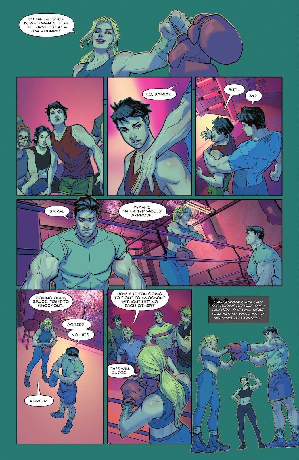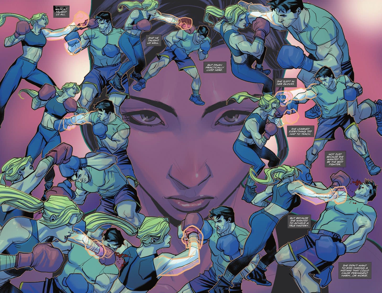 With Dinah Lance, in the boxing gym she grew up in and inherited from Wildcat, Ted Kord, and the wider Batman and Green Arrow family. And a challenge made… a boxing match in which no one actually hits each other, but the boxing intent itself is judged by Cassandra Cain.