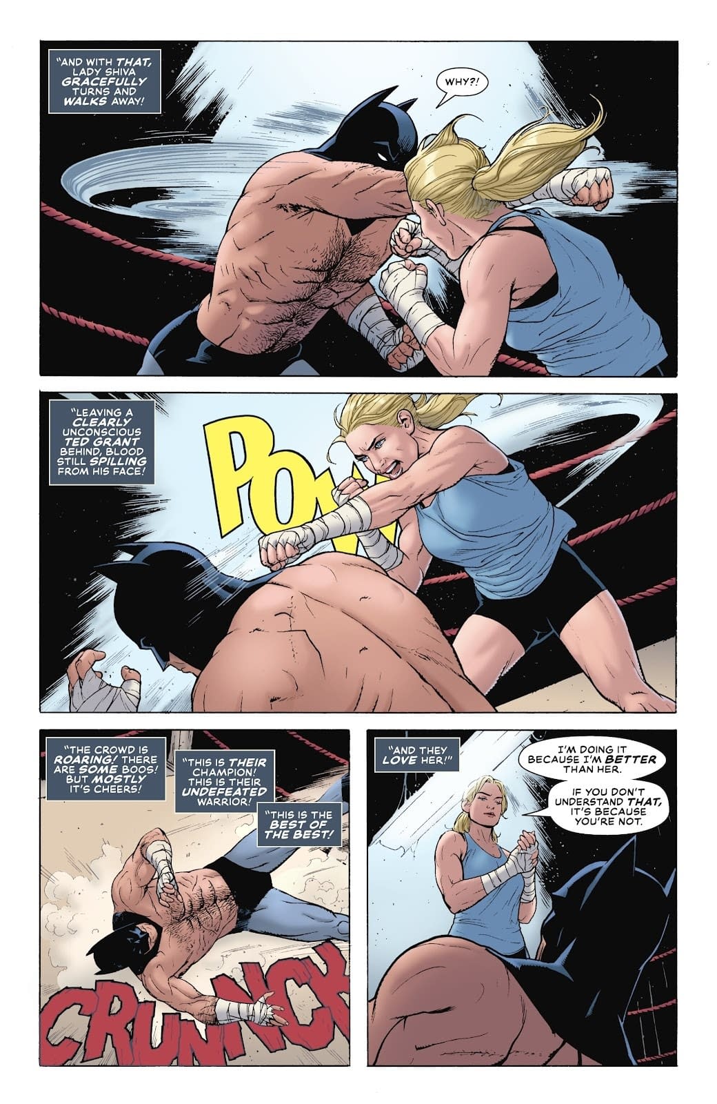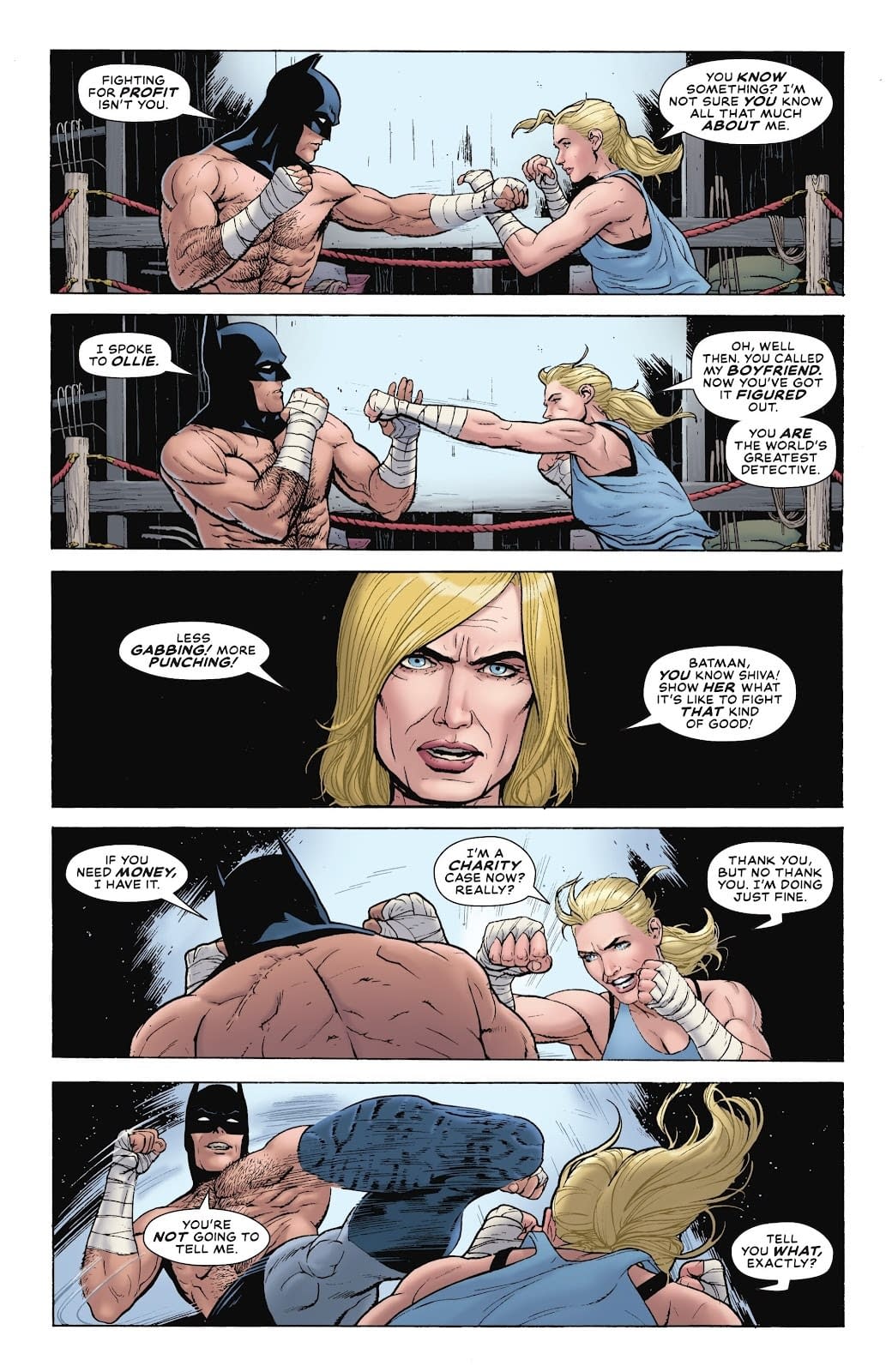 And of course everyone kicked off all over the place, whether or not Bruce Wayne could beat Dinah Lance in boxing, whether Dinah trained Bruce in hand-to-hand combat, and none of them recognised that in the actual comic book as published, upper body strength doesn't come into it. The recent Black Canary boxing comic, The Best Of The Best, with Dinah taking on Lady Shiva, from Tom King and Ryan Sook, is being cited…