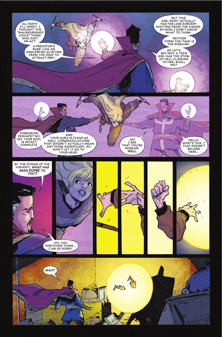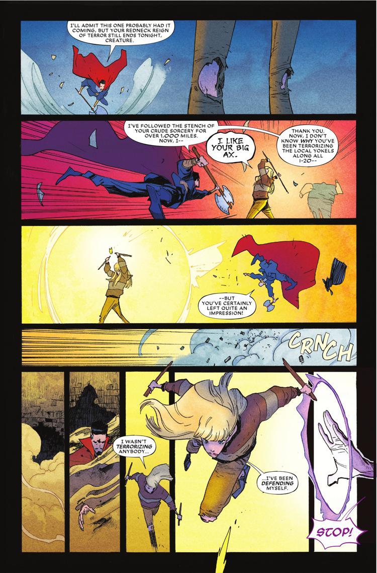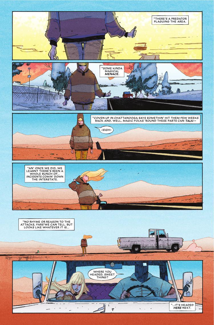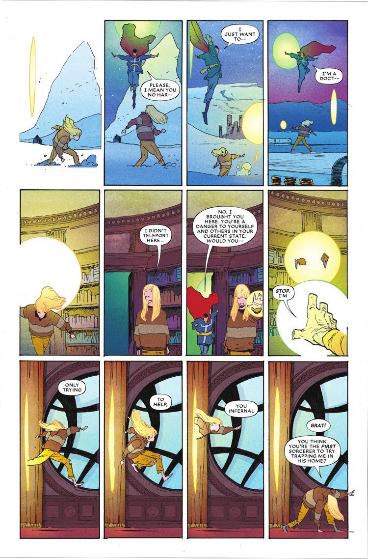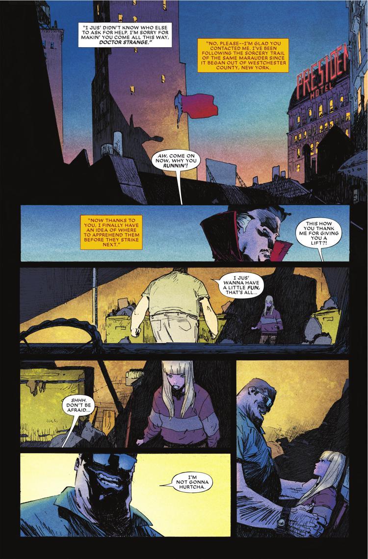 First, a scummy pickup truck drivers seems to believe Magik owes him sex after he gave her a ride as a hitchhiker, and he attempts to sexually assault Magik (but gets his ass kicked in the process). Not long after, Doctor Strange attempts to capture her, but once he uses his magic to learn what she's been through, he decides he needs to save her instead… whether she likes it or not.
