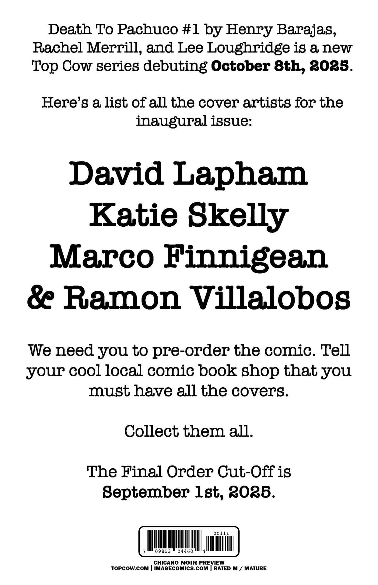 Image Comics publishes the Death To Pachuco comic by Henry Barajas and Rachel Merrill, for free, digitally, in black-and-white, ahead of FOC