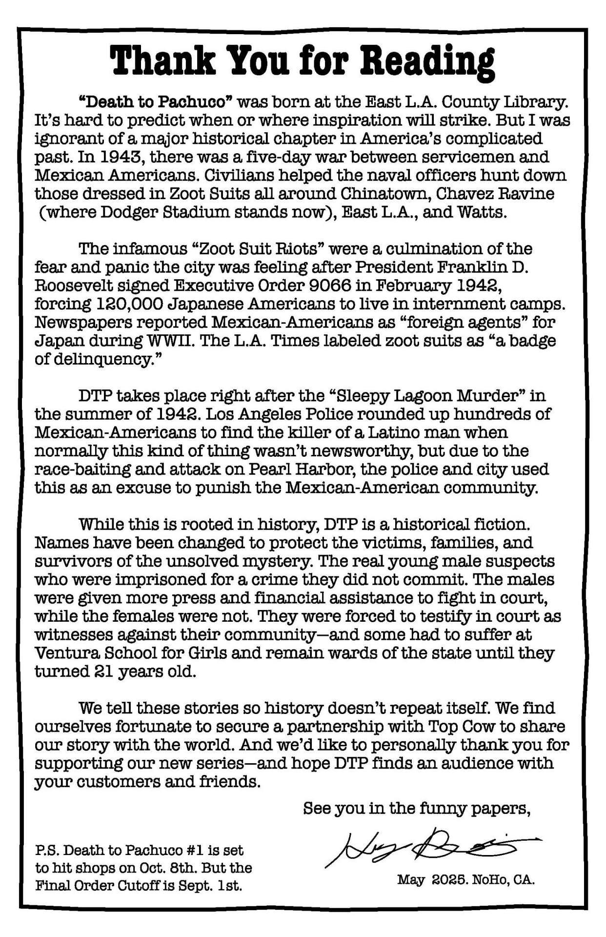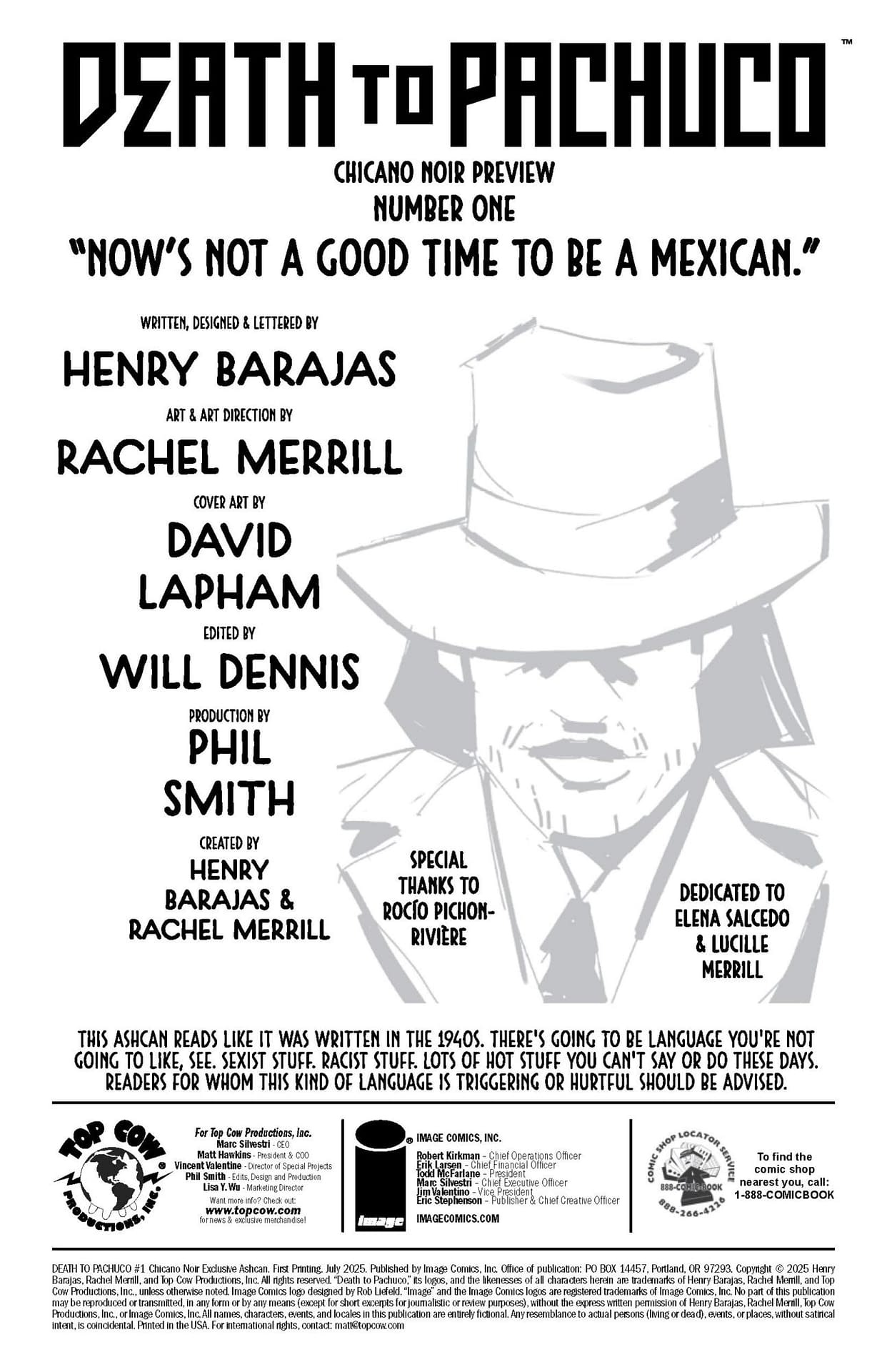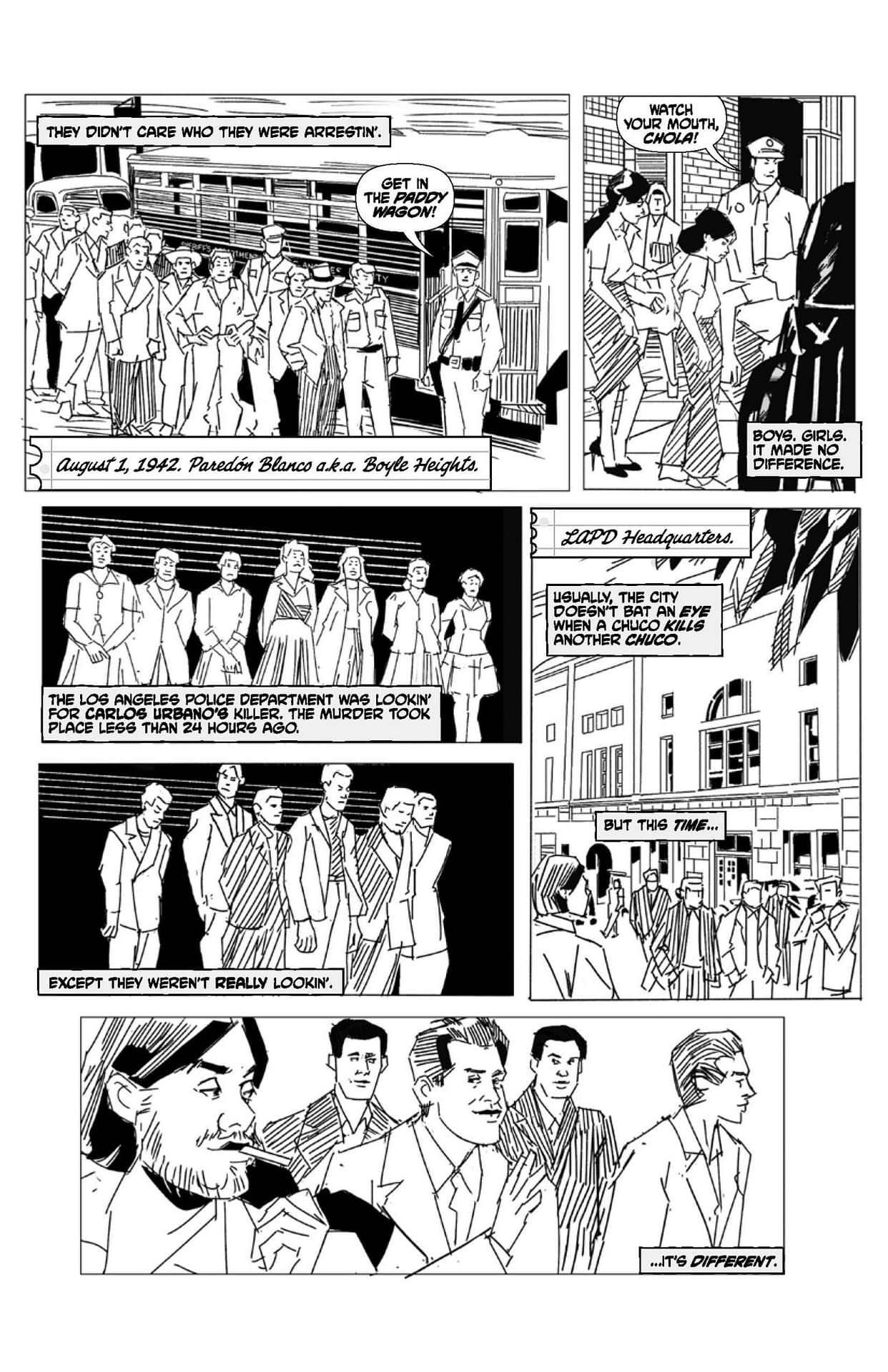 Death To Pacheco is a new comic book launching from Image Comics and Top Cow Studios on the 8th of October, by Henry Barajas, Rachel Merril and Lee Loughridge, which hits FOC today. And in a very unusual move, Image Comics has released the comic book digitally on their website in full black and white, the entire thing, while the colour version goes to Final Order Cut-Off today for comic book retailers. It is a rather interesting marketing technique which may be condemned by some, but the proof of the pudding is, as always, in the eating. As well as the video above, writer Henry Barajas tells Bleeding Cool, "Death to Pachuco takes place during a dark period in Los Angeles' history. US sailors took the streets and started beating and striping Mexican men. This is the most important story I've told in my career."