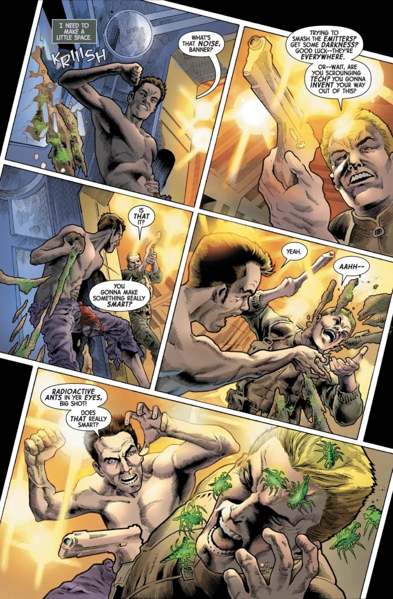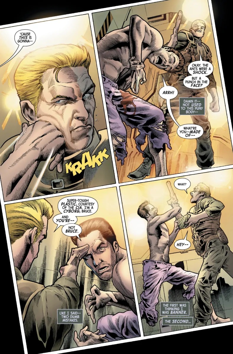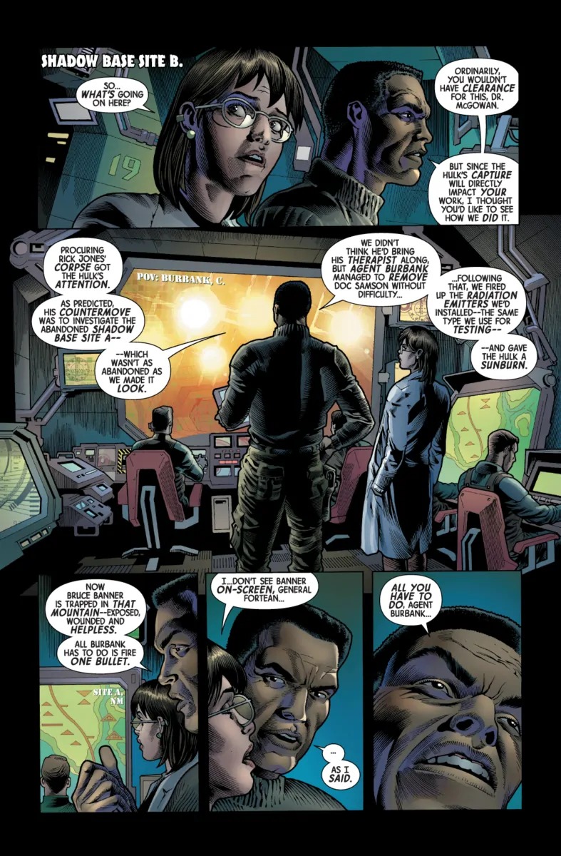 Bruce Banner is in trouble. Tricked by Shadow Base into entering a trap with artificial sunlight that prevents him from turning into the Hulk, he's now being hunted down by the cyborg Agent Burbank, who's totally gonna kill the star of Marvel's best-selling comic… after he's finished toying with him, first. But in this preview of Immortal Hulk #17, we see that Bruce Banner still has a few tricks up his sleeve…