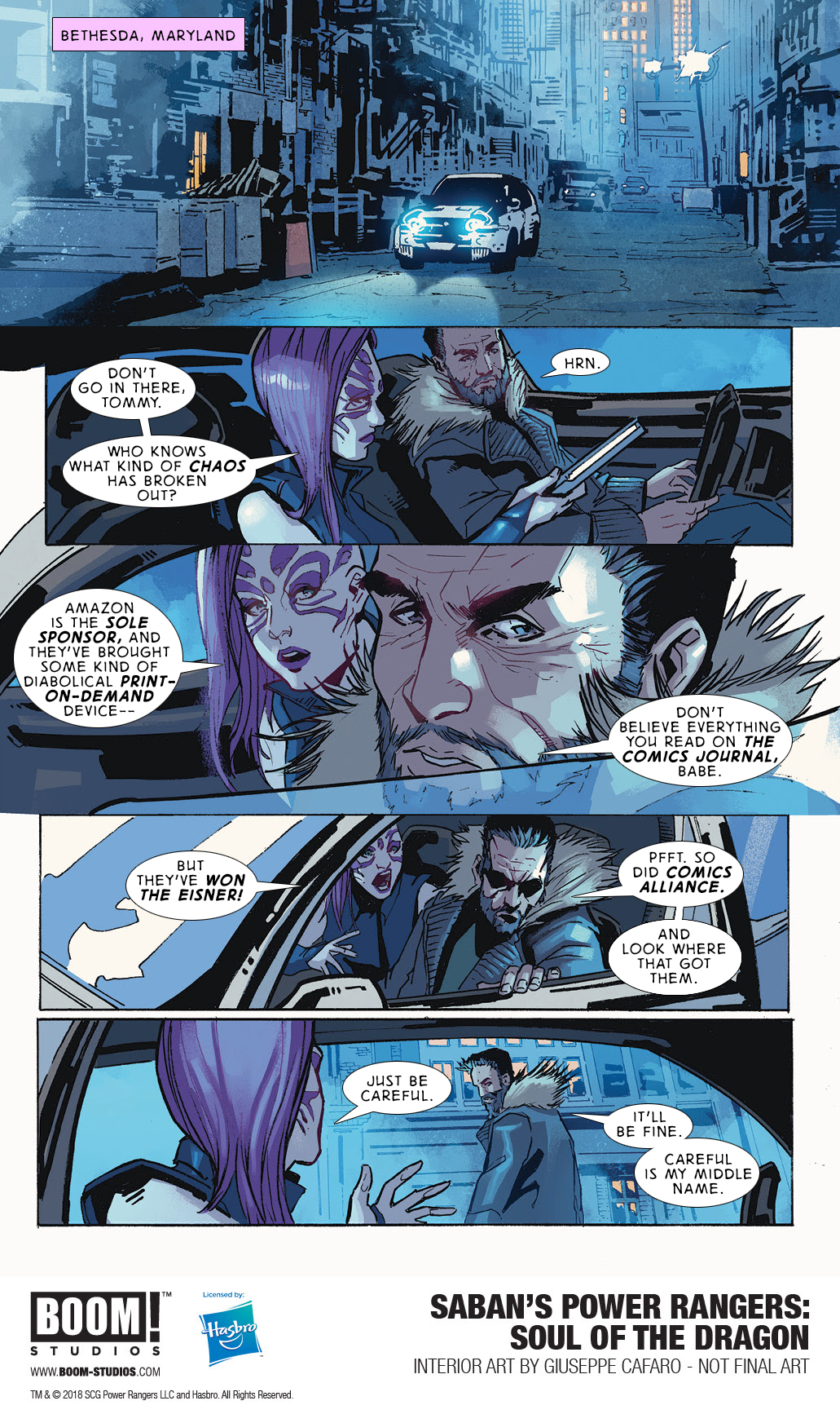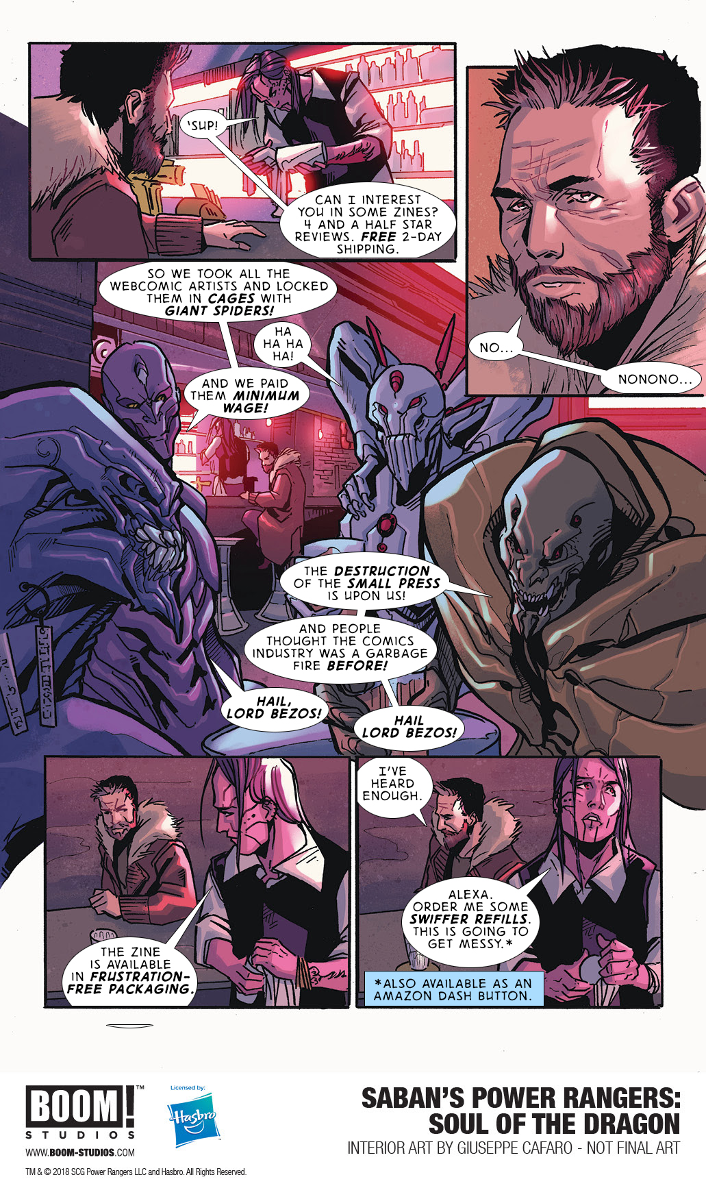 This December, Green Power Ranger Tommy Oliver gets his own solo OGN, written by Kyle Higgins with art by Giuseppe Cafaro and consultation by Jason David Frank himself. Explosive comic book publisher BOOM! Studios has sent out an unlettered preview, and we've taken the liberty of lettering it for them for free (which is admittedly not much less than BOOM! usually pays)! In Saban's Power Rangers: Soul of the Dragon, Tommy Oliver travels to the premier small press comics convention in the United States, but what he finds isn't a celebration of independent comics, but rather the exploitation of a creative industry by a soulless mega-corporation. No, not the three or four soulless mega-corporations already sucking comics dry for intellectual property opportunities. A brand new one!