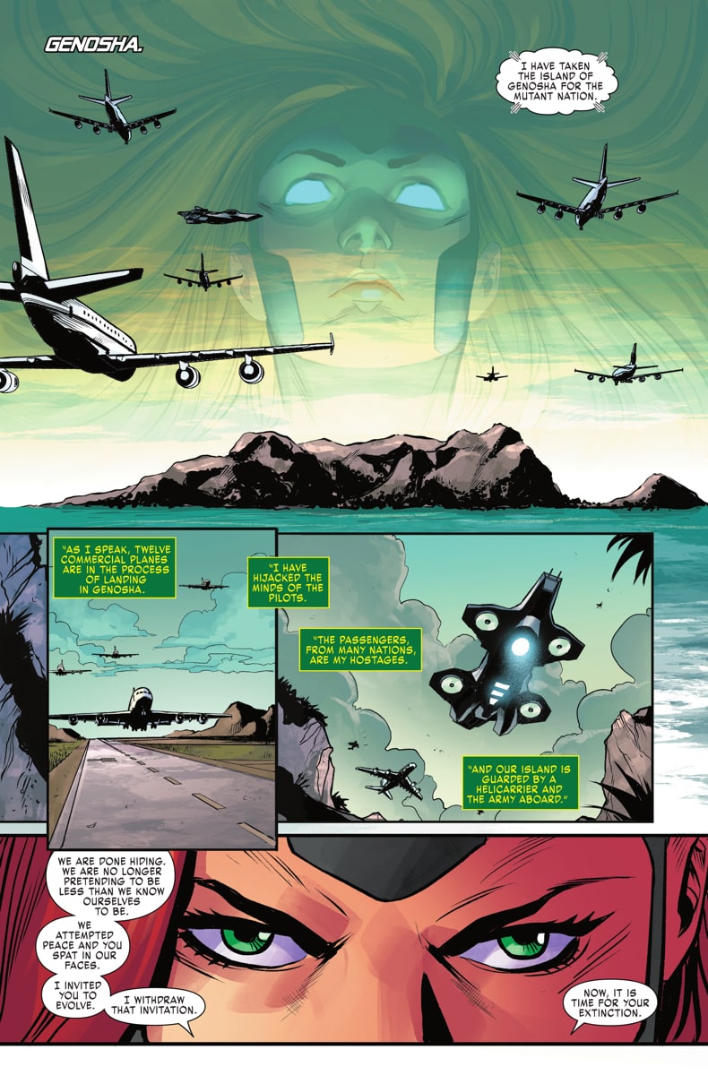 X-Men Red has been all about Jean Grey sending a message of hope and optimism, but it seems she's doing a major about-face in next week's X-Men Red #10. As a preview of the issue shows, Jean is now sending a message of "@#$% you, humanity," along with a rant about how mutants have played nice while humans royally screwed up the world, and since the carrot hasn't been working, it's time to try the stick. And the stick is the extinction of the human race.