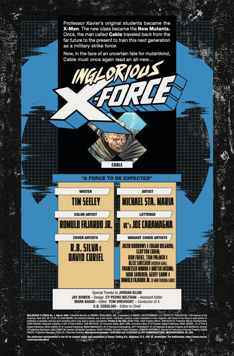 - Cover image for 75960621362700111 INGLORIOUS X-FORCE #1 R.B. SILVA COVER, by Tim Seeley & Michael Sta. Maria & R.B. Silva, in stores Wednesday, January 21, 2026 from Marvel