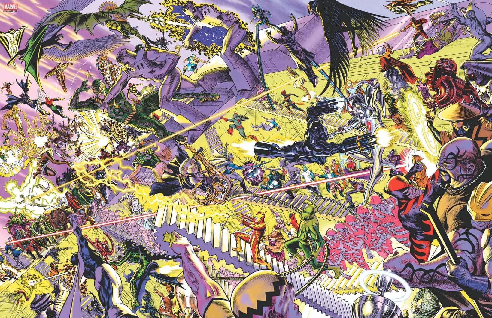 While in the Marvel ComicsPRO presentation, Marvel exec David Gabriel told retailers that "Marvel Dimensions, this is a book by Alex Ross from Abrams coming out in September, that I got to see the pages of. Alex is telling a new version of the all the origins of Marvel characters and Alex designed these amazing two page spreads in this giant book that tell a different origin of all of our characters. And on the right hand side page, he did a beautiful Alex Ross painting of all of these Marvel characters, and he asked if we could do them as variant covers. It's not like you have to ask me to do that, but he did it, and I just wanna show you those, and then I will run off." So as the Marvel Dimensions book comes out from Abrams ComicArt in September 2026, Marvel Comics will run the splash character pages as variant covers in their comics for that month or in the run up. And looking a bit like this.
