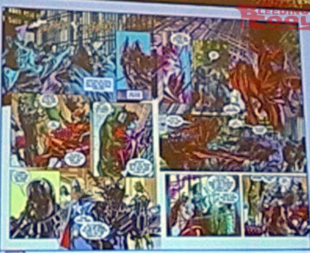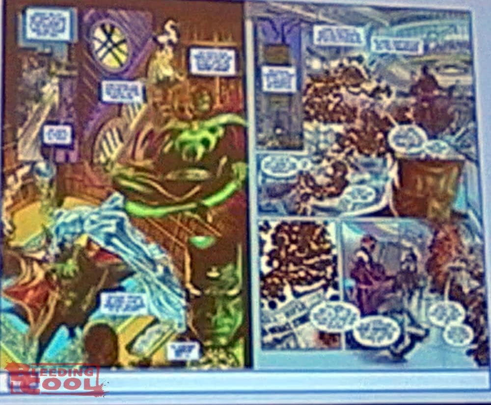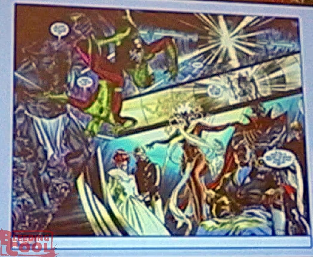 At ComicsPRO, Abrams Books presented the upcoming Marvel Arts graphic novel they are publishing with Marvel Comics, Marvel Dimensions by Alex Ross, saying, "his previous book with Abrams was Fantastic Four: Full Circle" which they report as sellign 66,000 copies, "and we're thrilled to be able to bring Marvel Dimensions to the comic market here. It's Alex's tribute to the greatest heroes and villains of all time and it transforms into something stranger and far more ambitious than anyone has ever done with a Marvel graphic novel before. And we have a comic within the book, so this is something that people want to pick up, and we're glad to bring this to you. And we have a poster we'll be giving out at the round tables tomorrow." You can catch up with the rest of our ComicsPRO coverage here….