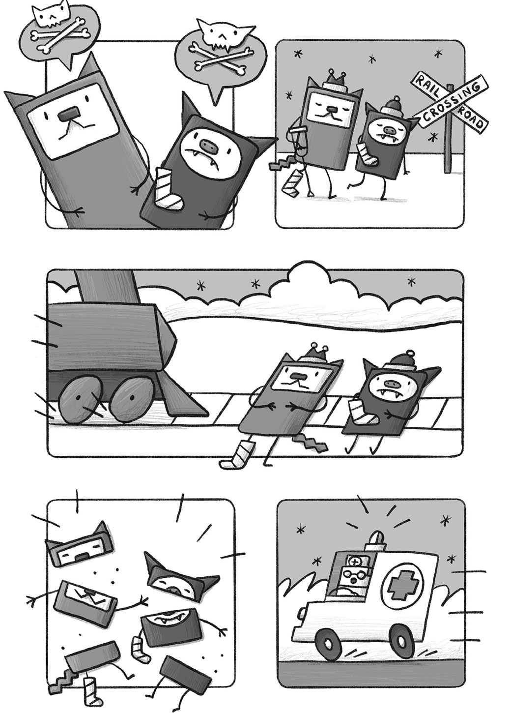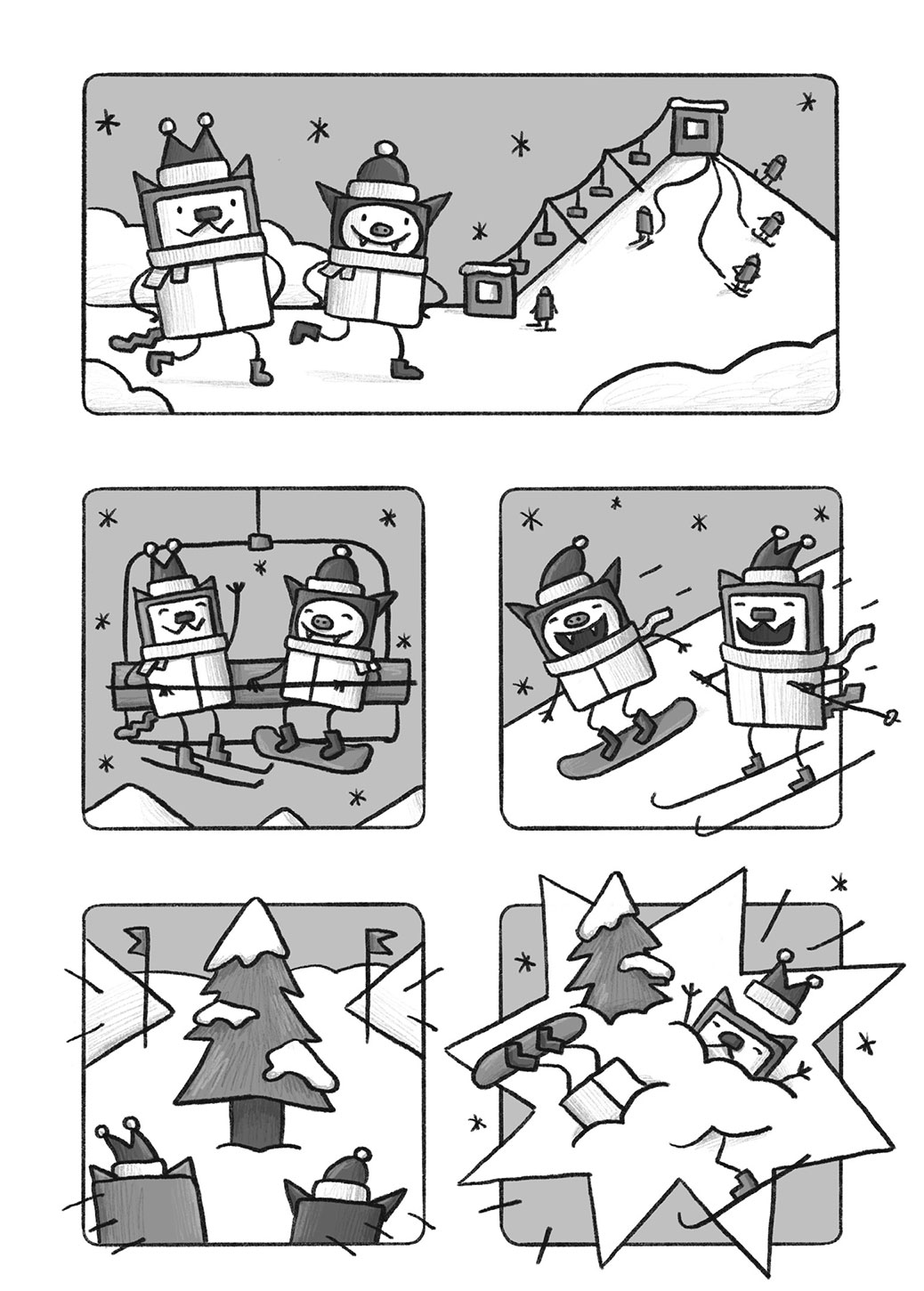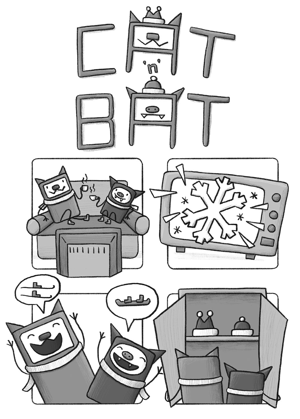 Cat'N'Bat marks the graphic novel debut for Sashko Danylenko, an animator and artist originally from Ukraine. While some authors go all-in on plots, Danylenko's stories are simple, six-page tales about a pair of mischievous, box-shaped friends (a cat and a bat) that go on ill-fated adventures.